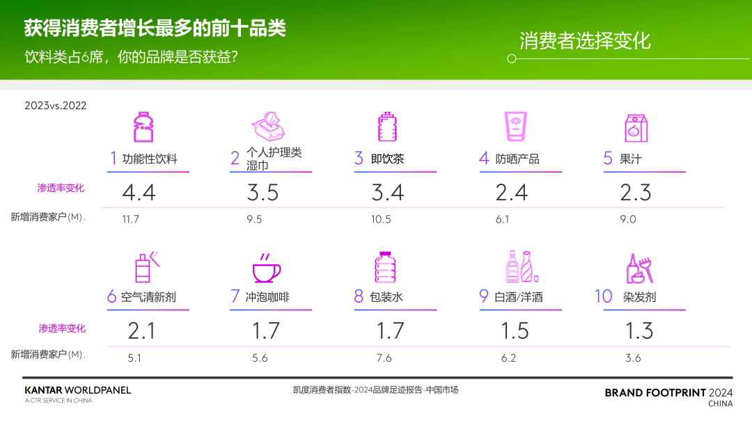3. 2023年消费者的品类购买偏好有所转移,在拉新最成功的前十品类中,饮料类占6席