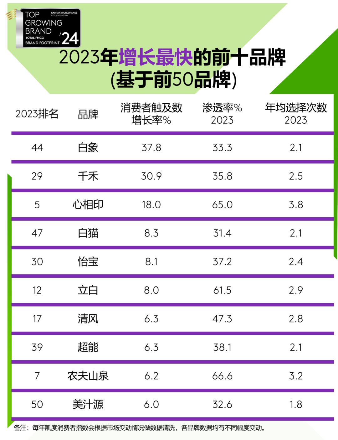 凯度消费者指数发布了《2024品牌足迹报告》中国快速消费品市场消费者首选品牌前50榜单,并通过分析上榜品牌的表现,揭示了在新现实下中国品牌增长的核心动因。