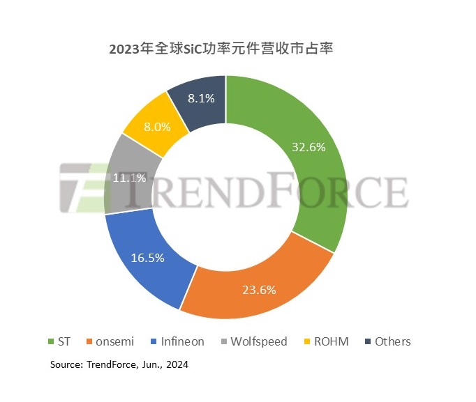 据TrendForce集邦咨询研究显示,2023年全球SiC功率元件产业在纯电动汽车应用的驱动下保持强劲成长,前五大SiC功率元件供应商约占整体营收91.9%,其中ST以32.6%市占率持续领先,onsemi则是由2022年的第四名上升至第二名。