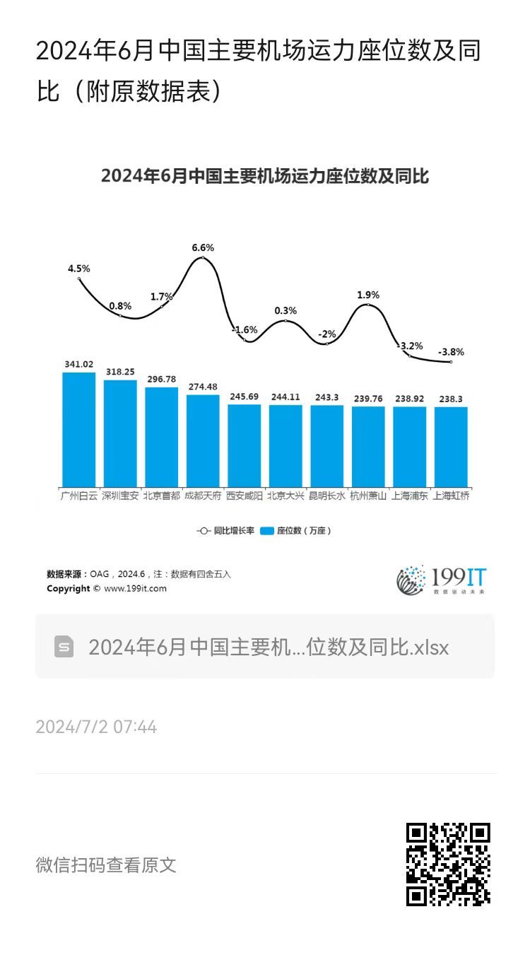 - 2024年7月中国主要机场运力座位数及同比(附原数据表)