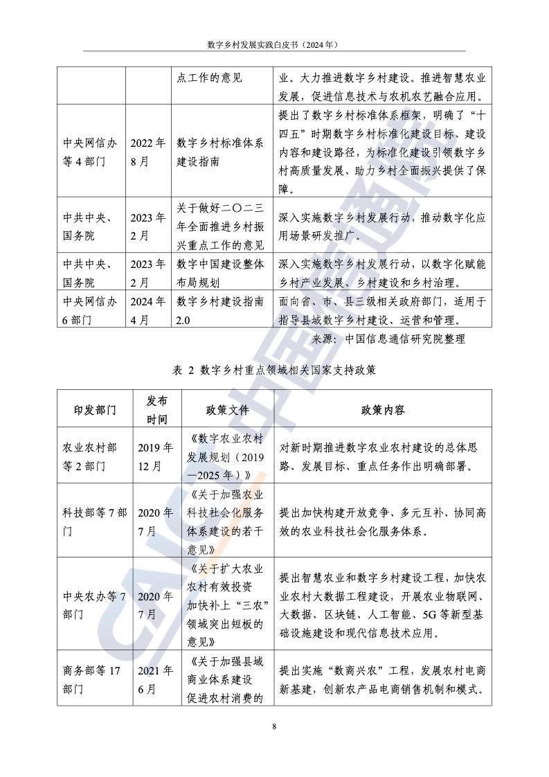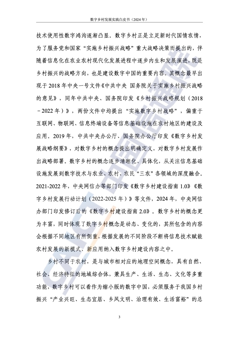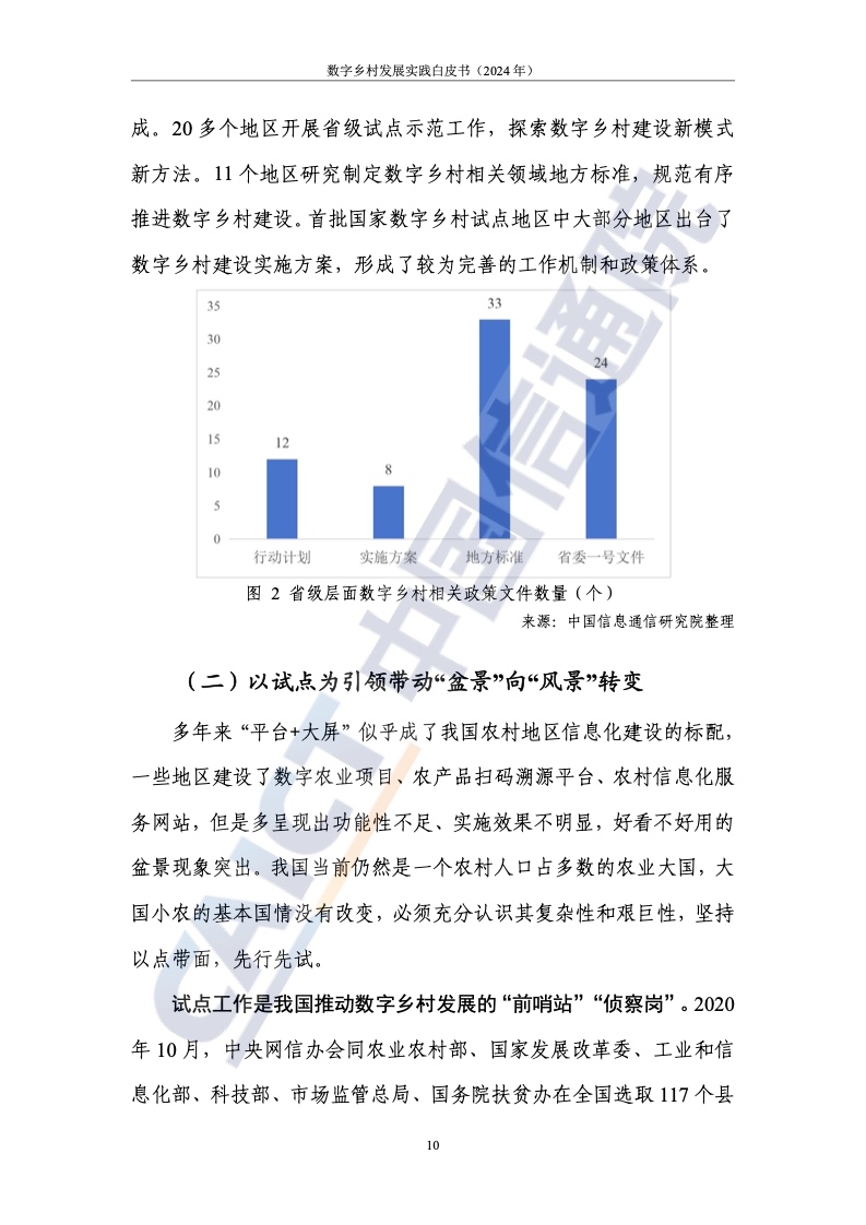 近日,中国信息通信研究院(简称“中国信通院”)发布了《数字乡村发展实践白皮书(2024年)》,系统梳理了我国提出数字乡村发展战略以来,政府、企业、高校、科研院所和社会组织等各类主体在相关领域的实践做法及成效,充分结合国家数字乡村试点和多个省级试点发展经验,总结提炼了基于实践的经验模式和路径,希望为政府、行业、企业决策提供参考。