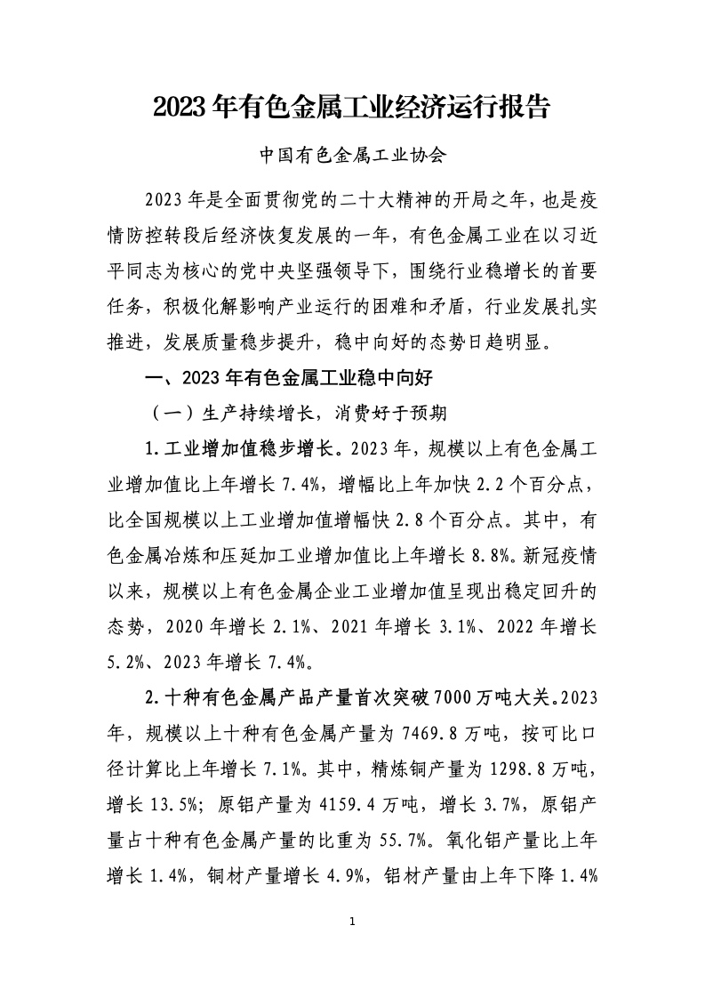 2023年,规模以上十种有色金属产量为 7469.8 万吨,按可比口径计算比上年增长 7.1%。其中,精炼铜产量为 1298.8 万吨,增长 13.5%;原铝产量为 4159.4 万吨,增长 3.7%,原铝产量占十种有色金属产量的比重为 55.7%。