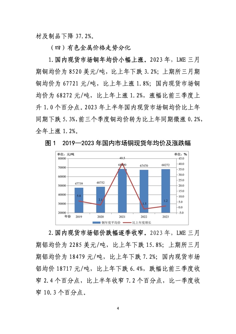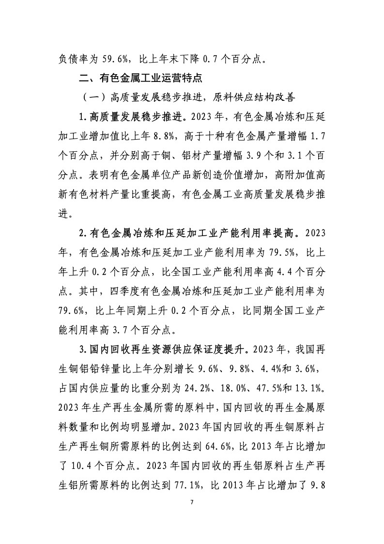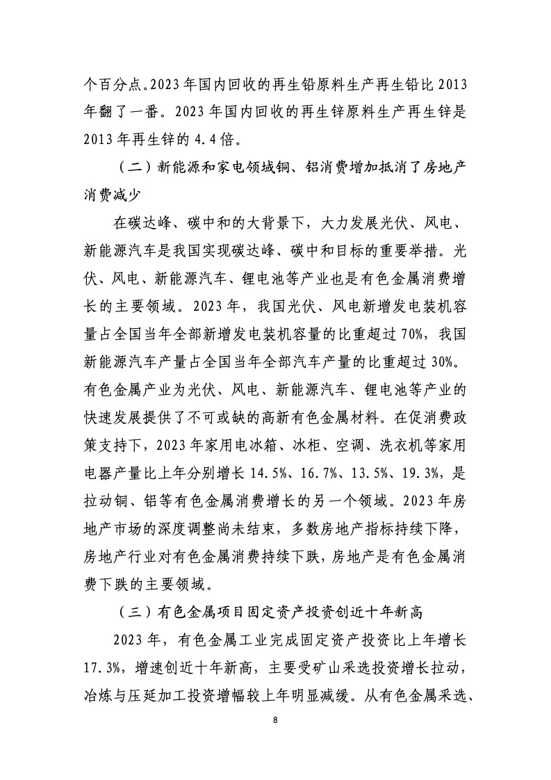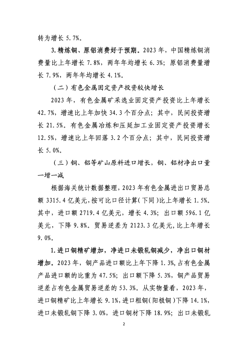 2023 年,中国精炼铜消费量比上年增长 7.8%,两年年均增长 6.3%;原铝消费量增长 7.9%,两年年均增长 4.1%。