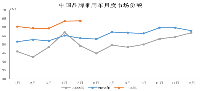 中汽协:2024年5月中国品牌乘用车销售情况简析 据中国汽车工业协会统计分析,2024年5月,中国品牌乘用车共销售132.3万辆,环比增长4%,同比增长20.4%,占乘用车销售总量的63.7%,占有率比上年同期提升10.2个百分点。 2024年1-5月,中国品牌乘用车共销售598.7万辆,同比增长25.2%,占乘用车销售总量的61.3%,占有率比上年同期提升8.2个百分点。 更多阅读:中汽协: 2021年7月乘用车产销分别完成154.8万辆和155.1万辆中汽协:2024年4月中国品牌乘用车销售情况简析中汽协:2021年上半年前十位轿车品牌销量排名中汽协: 2021年1-5月汽车商品出口金额排名前十位国家情况简析中汽协:2024年1-5月前十位汽车生产企业(集团)销售情况简析中汽协:2021年7月商用车产销分别完成31.5万辆和31.2万辆中汽协:2024年5月汽车出口情况简析中汽协:2022年1-2月汽车类零售额同比呈小幅增长中国汽车工业协会:2022年1-5月前十家SUV生产企业销售情况简析中汽协:2021年1-11月中国汽车整车进口前十国情况简析中汽协:2021年1-11月中国汽车商品出口金额前十国情况简析中汽协:2021年上半年汽车制造业营业收入超过4万亿元中汽协:2021年11月份主要汽车企业销量数据中汽协:2024年1-4月前十位MPV生产企业销售情况简析中汽协:2021年上半年前十位轿车品牌销量排名