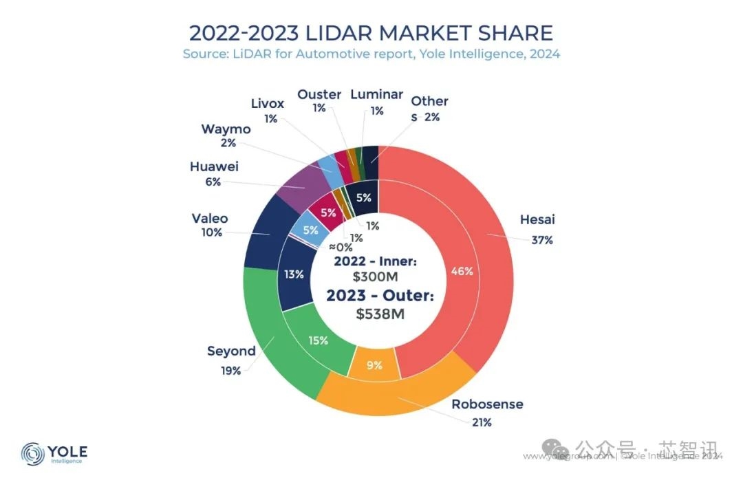 排名第二的同样是中国的速腾聚创(Robosense),市场份额为21%,相比2022年实现了翻倍增长(增长了12个百分点),这主要得益于其用于ADAS的激光雷达产品收入的大幅增长。