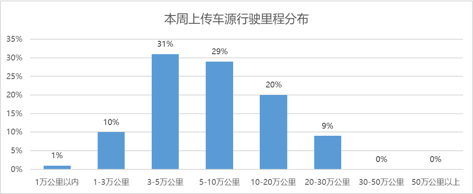 从上传车源行驶里程数据来看,本周上传数据中,1-3万公里的“准新车”数据增加1%,3-5万公里以内的“较新车”与上周持平,5-10万公里的“性价比”车源数据较上周减少1%,10万公里以上的“老旧车”数据与上周持平。
