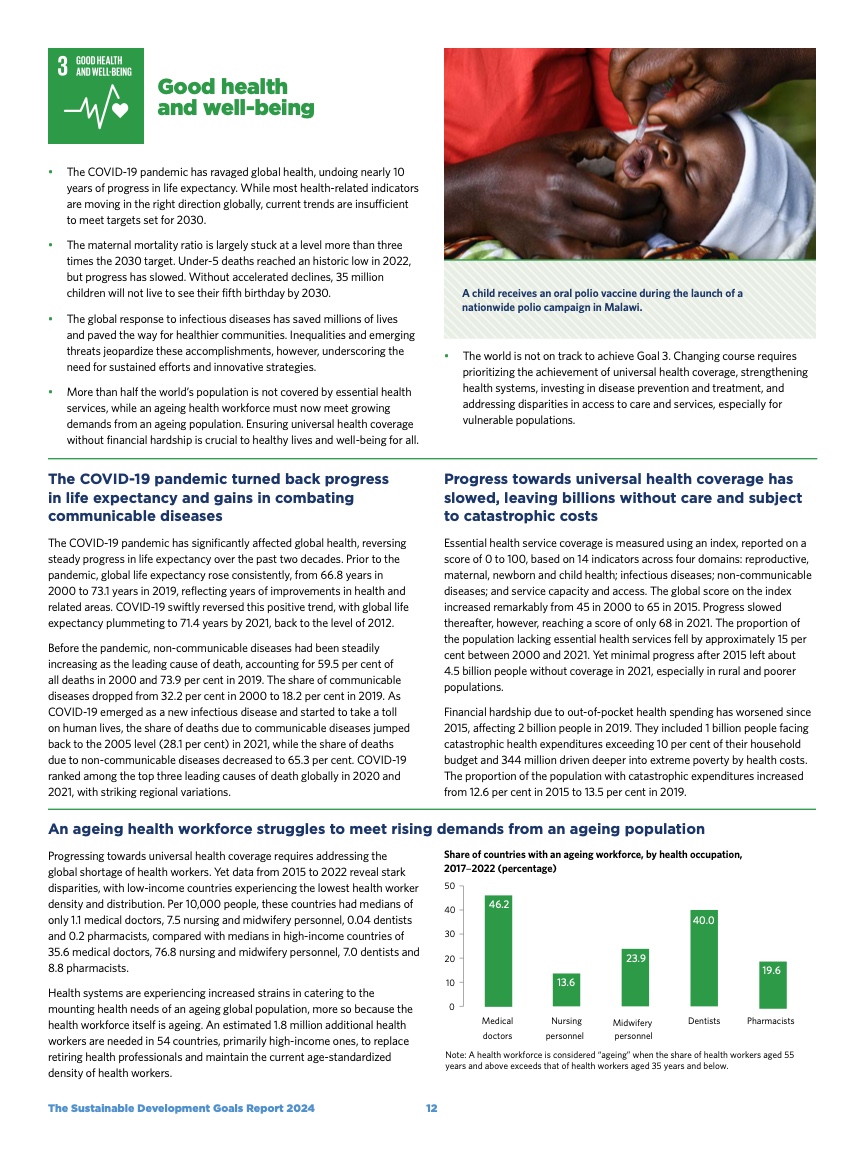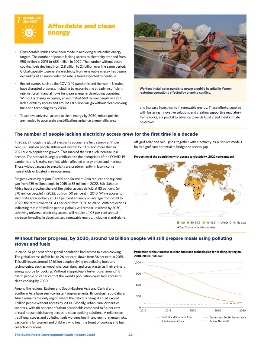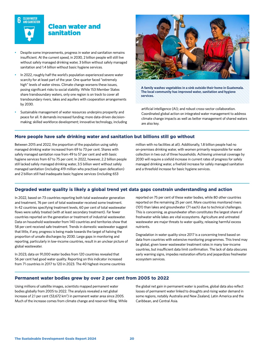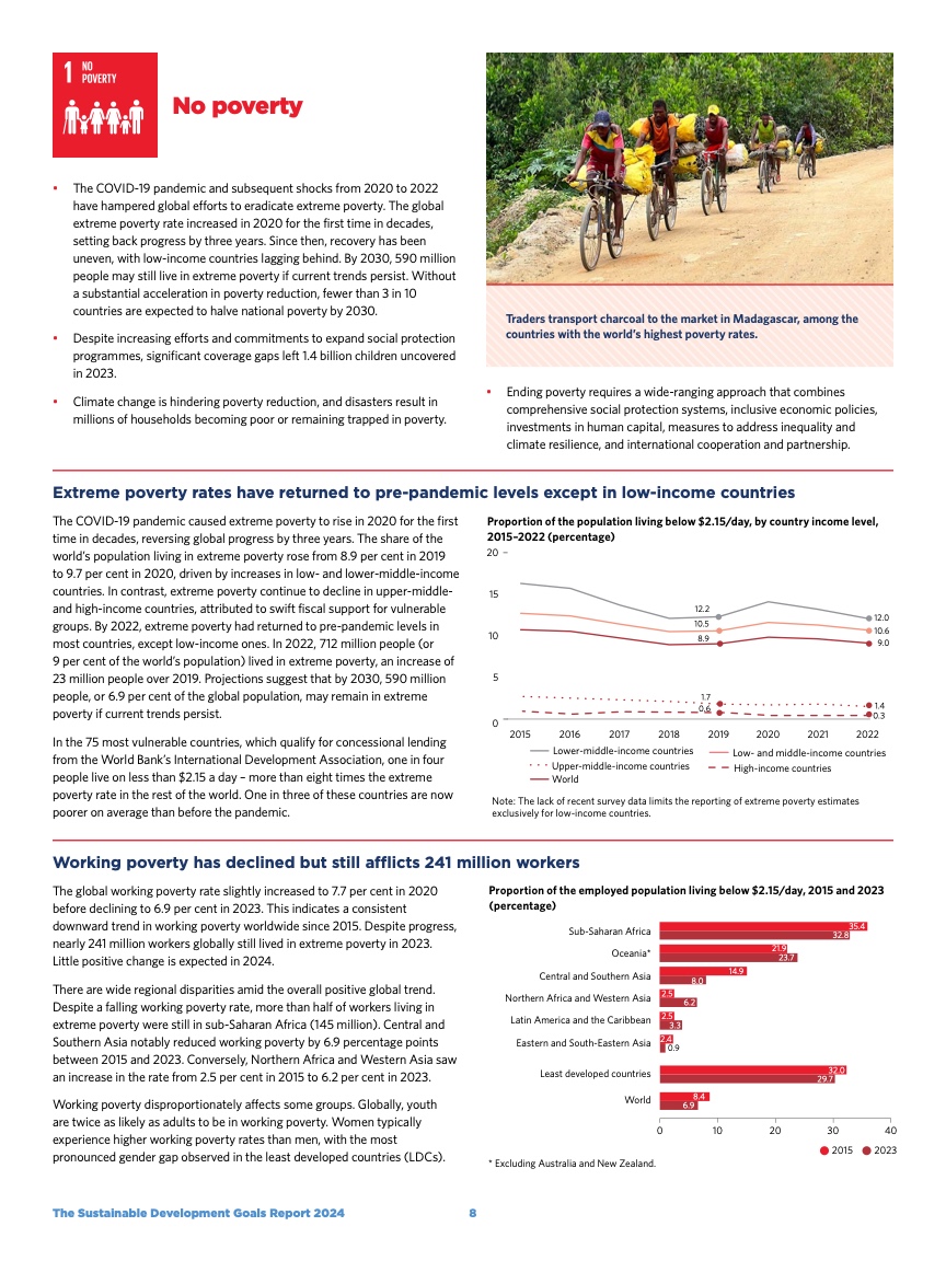 《2024 年可持续发展目标报告》 显示,可持续发展目标中仅有17%的目标目前进展顺利,近一半的目标进展甚微或一般,超过三分之一的目标停滞不前或出现倒退。2019新冠大流行的影响挥之不去,冲突不断升级,地缘政治紧张局势和日益严重的气候混乱严重阻碍了这些目标的进展。