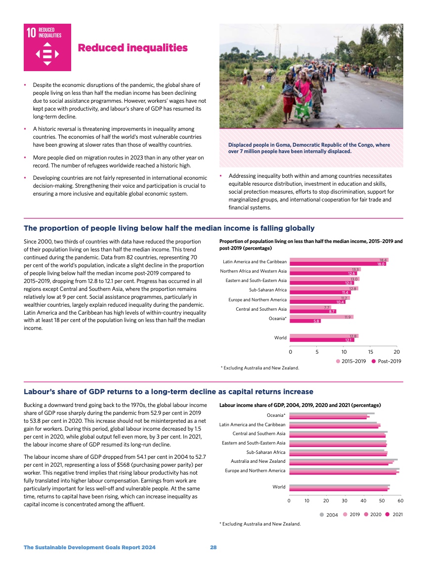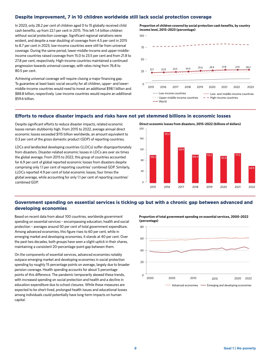 报告显示,与2019年相比,2022年新增2300万人陷入极端贫困,1亿多人遭受饥饿。2023年,死于武装冲突的平民人数激增。这一年也是有史以来最热的一年,全球气温升幅接近1.5°C的临界点。