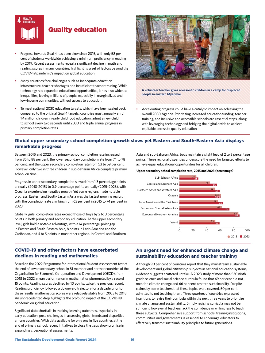 教育方面的进展仍然令人严重关切,全世界只有58%的学生在小学毕业时达到了最基础的阅读水平。