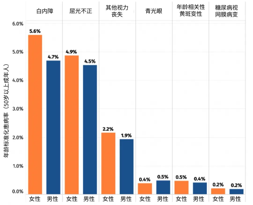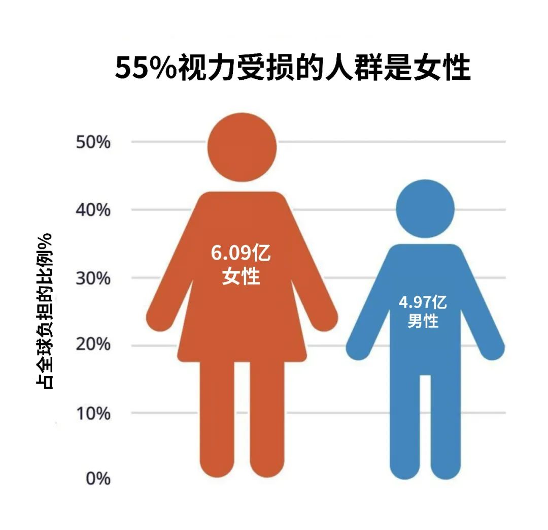 - 由于女性预期寿命比男性更长,其患眼疾的负担也更重。