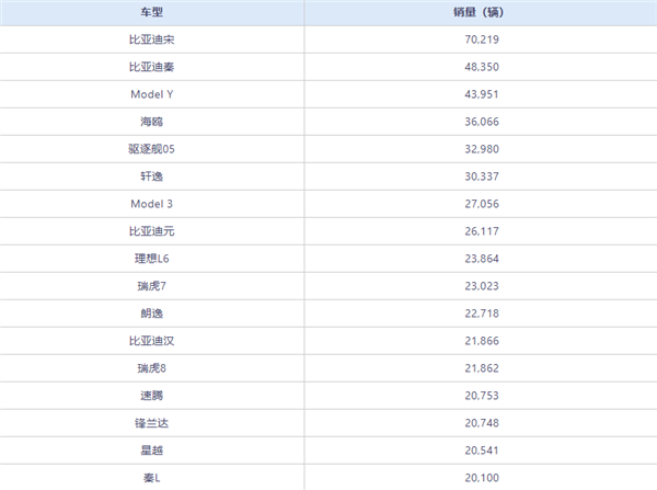 具体车型来看,比亚迪宋(70219辆)、比亚迪秦(48350辆)霸榜前二,特斯拉Model Y以43951辆位居第三。