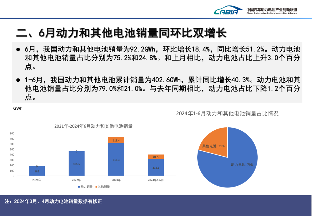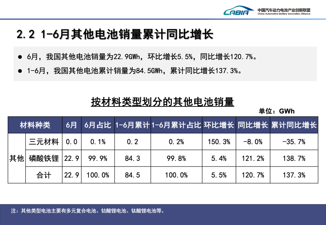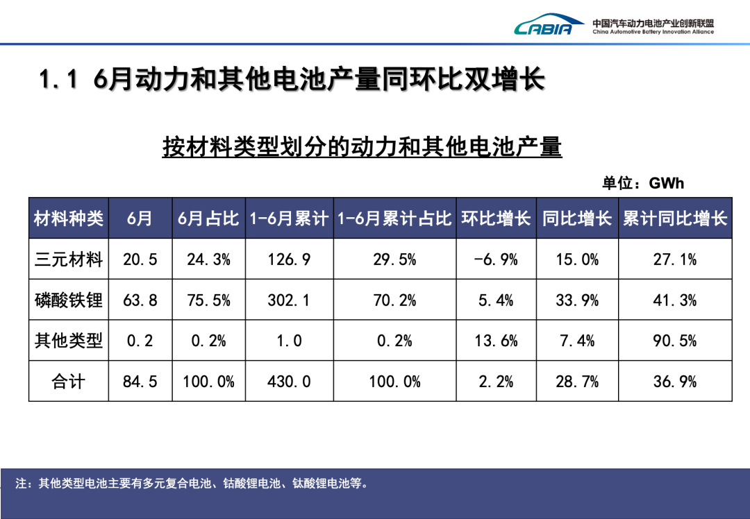 6月,在新能源汽车市场带动下,我国动力和其他电池合计产量为84.5GWh,环比增长2.2%,同比增长28.7%。