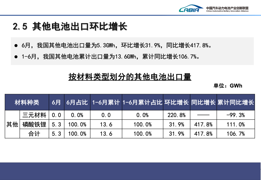 1-6月,我国动力和其他电池累计出口达73.7GWh,累计同比增长18.6%,合计累计出口占前6月累计销量18.3%。其中,动力电池累计出口量为60.0GWh,累计同比增长8.2%;其他电池累计出口量为13.6GWh,累计同比增长106.7%。动力和其他电池占比分别为81.5%和18.5%,和上月累计量相比,动力电池占比下降3.4个百分点。