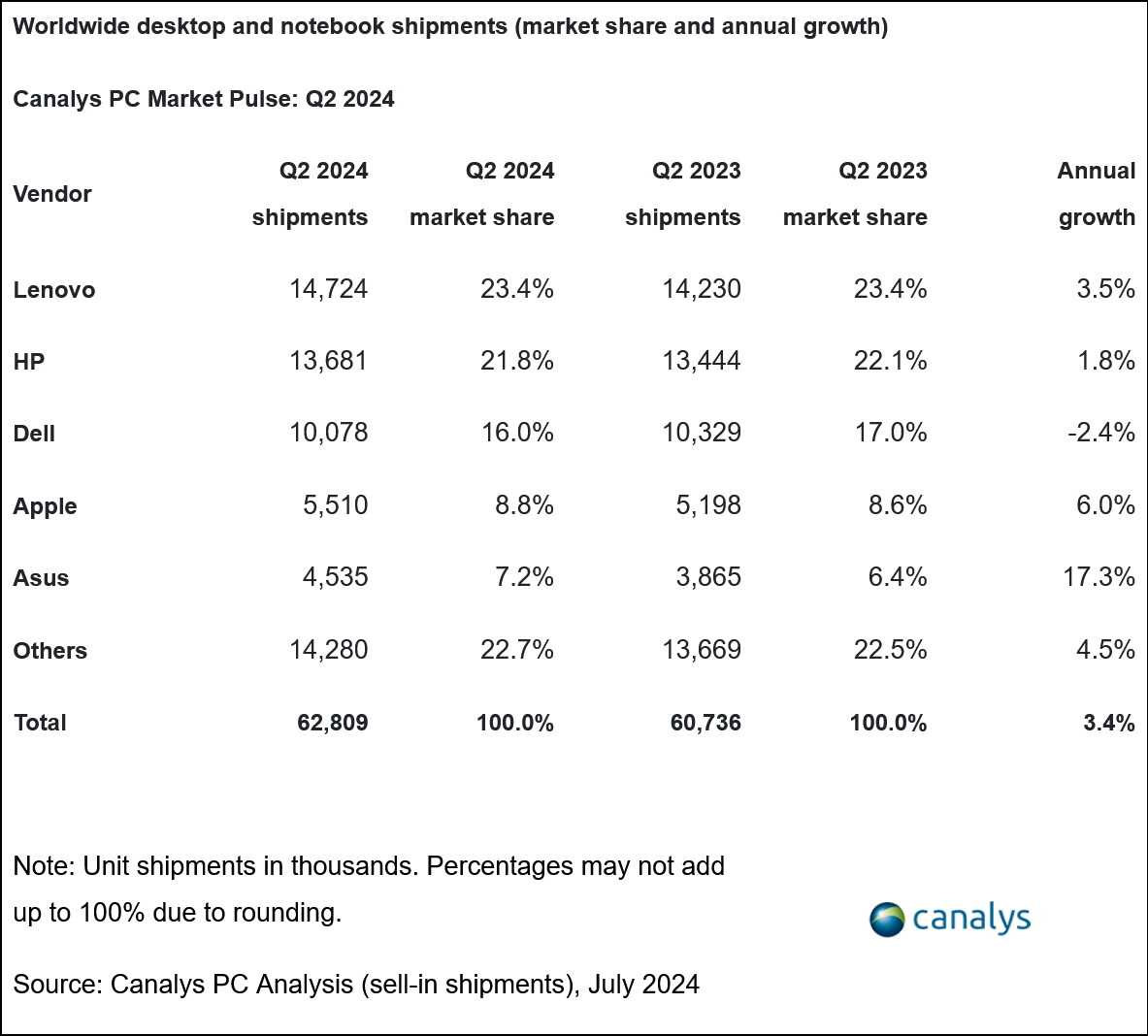 Canalys 表示,市场已经出现转机,连续第三个季度实现增长。预测这一趋势将持续下去,主要是因为 Windows 10 的支持将于 2025 年 10 月结束,这将促使升级周期的到来。不过,该公司也表示,随着 苹果公司宣布推出”Apple Intelligence”(Apple Intelligence), 苹果公司的人工智能战略将更加清晰,因此该公司的增长将继续上升。