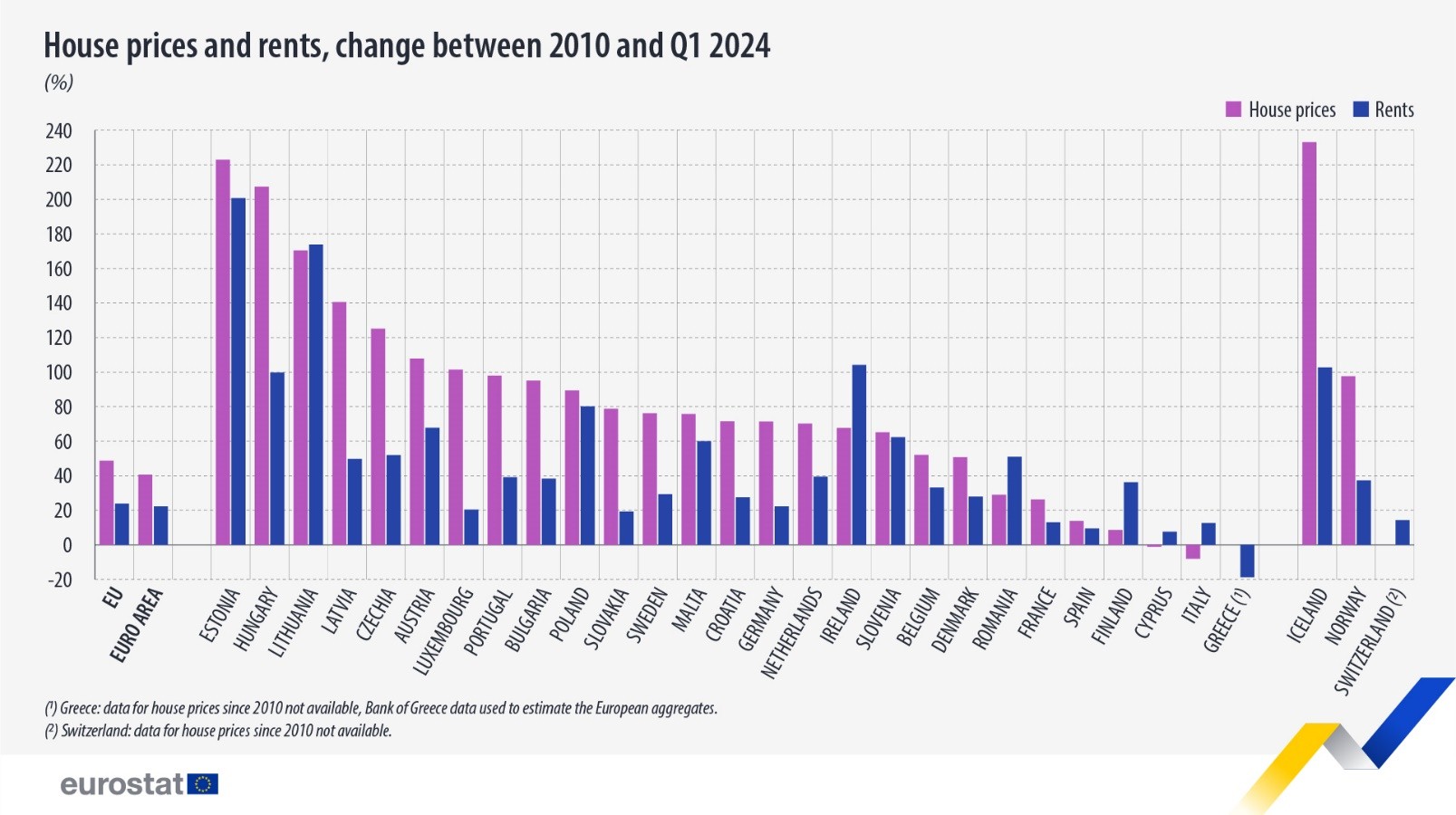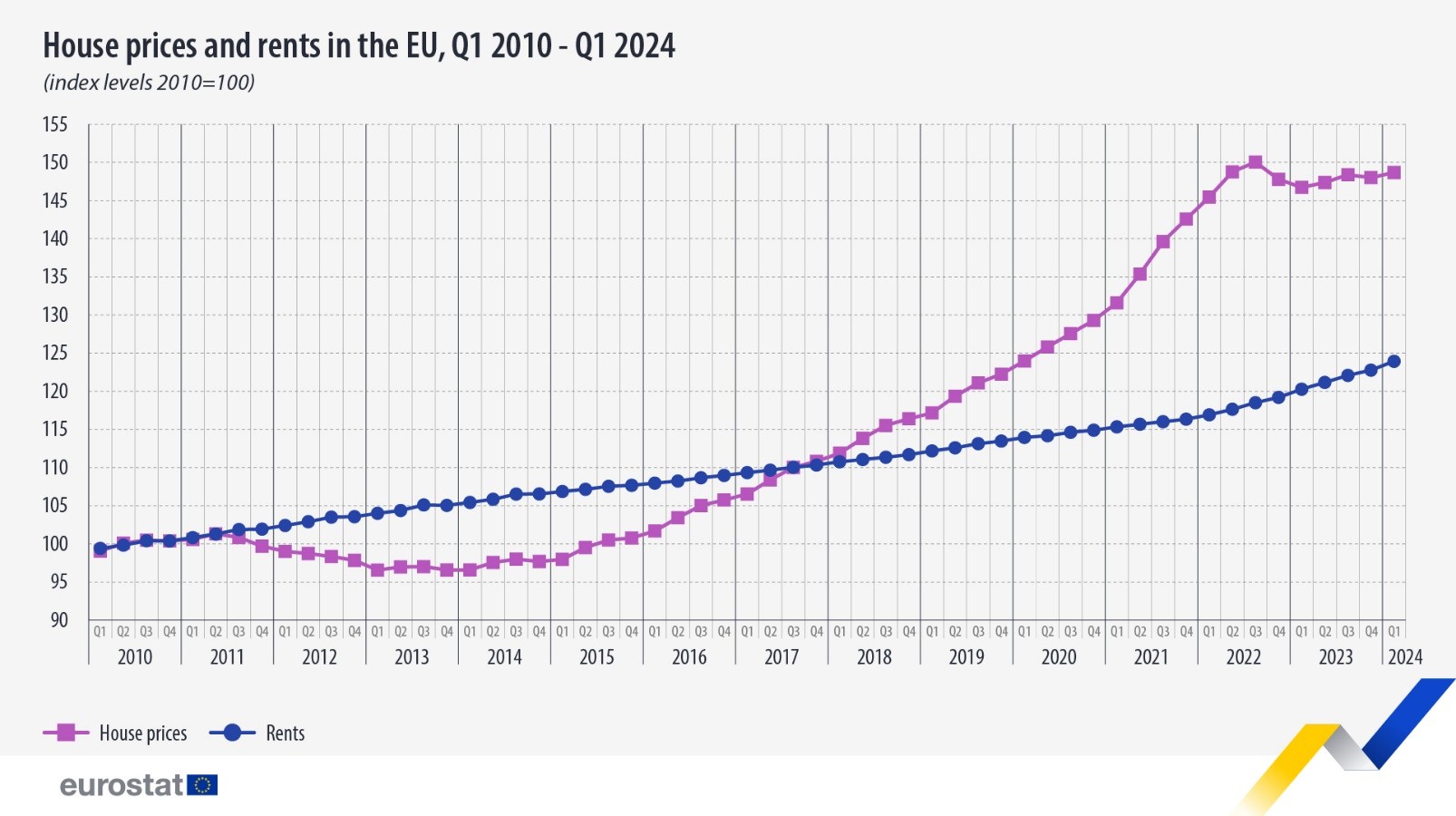 从2010年到2024年第一季度,欧盟的房价上涨了49%,租金上涨了24%。
