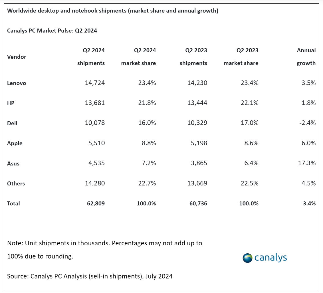 联想在全球个人电脑市场上保持了领导者的地位,2024年第二季度出货量为1470万台,年增长率为4%。惠普紧随其后,出货量为1370万台,稳居第二。戴尔(Dell)排名第三,但它是唯一一家报告年度出货量下降的厂商,同比下降2%,发货量为1,010万台。这种下降主要是由于美国市场的出货量减少,而其他主要供应商则出现了增长。苹果位居第四,出货量为550万台,占9%的市场份额,比去年同期增长6%。由于游戏PC的成功,华硕(Asus)超越宏碁(Acer)跻身前五。华硕在2024年第二季度实现了最高的增长,年增长率为17%,出货量为450万台。