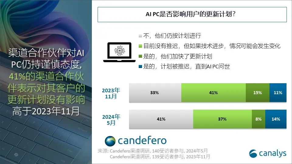 渠道合作伙伴将在AI PC 大规模普及中发挥至关重要的作用。Canalys最新渠道调研显示,截至2024年5月,渠道合作伙伴对这一机会仍持谨慎态度,41%的受访者表示,AI PC对用户的更新计划没有影响,比2023年11月的33%有所增加。这反应一个重要的现实——对许多用户来说,AI PC的益处和使用案例仍然模糊不清。作为一家以渠道为先的公司,联想有责任教育和帮助合作伙伴,使其成为AI PC坚定的支持者,尤其是在当前Windows更新周期中,因为许多终端客户将升级其PC设备。