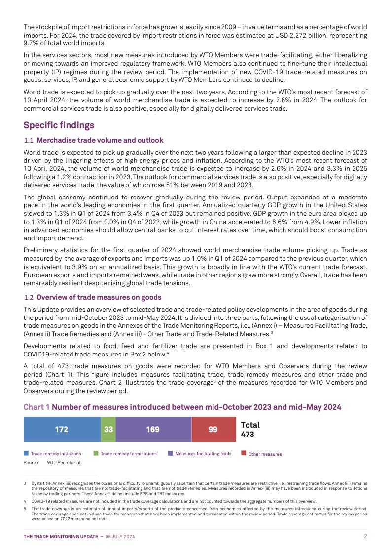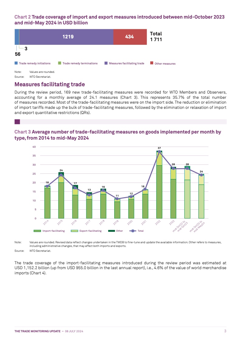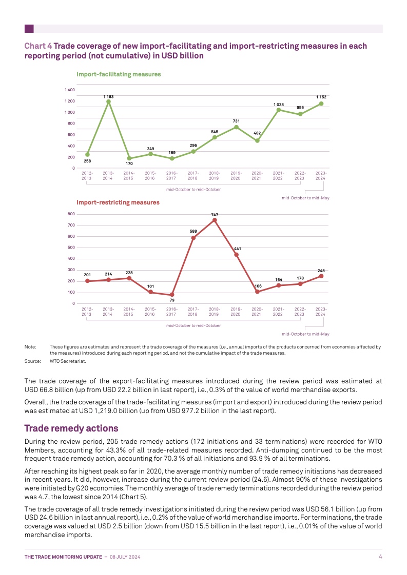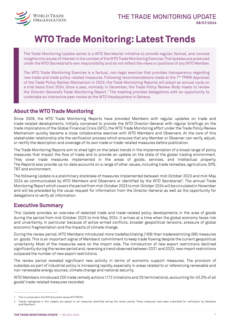 根据7月8日发布的最新一期《贸易监测快报》,世贸组织成员在货物贸易方面采取的贸易促进措施继续多于贸易限制措施,这是一个重要信号,表明尽管当前地缘政治存在不确定性,各成员仍致力于保持贸易畅通。该《报告》涵盖 2023 年 10 月中旬至 2024 年 5 月中旬,其中还指出,产业政策补贴迅速增加,尤其是在与气候变化和国家安全相关的领域。