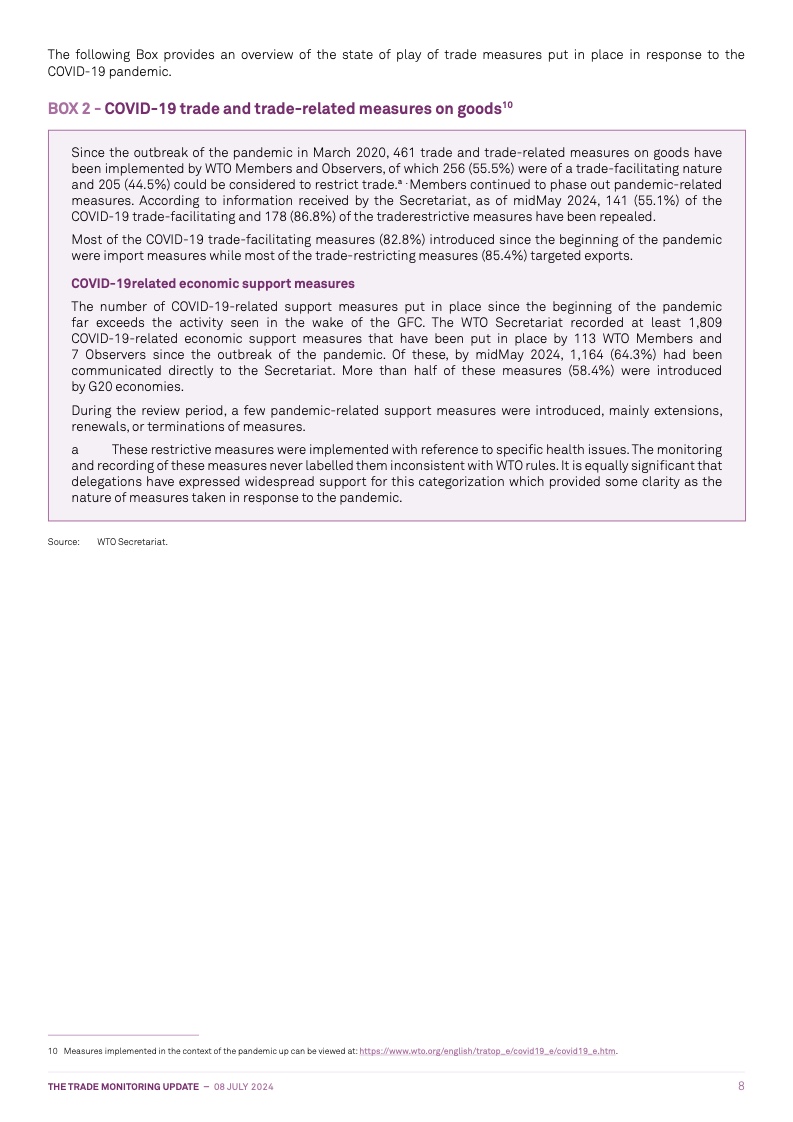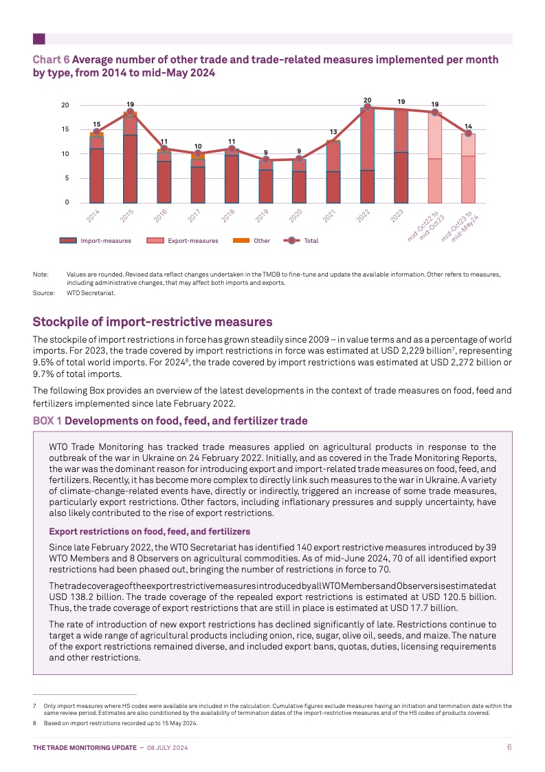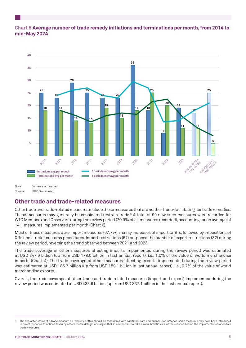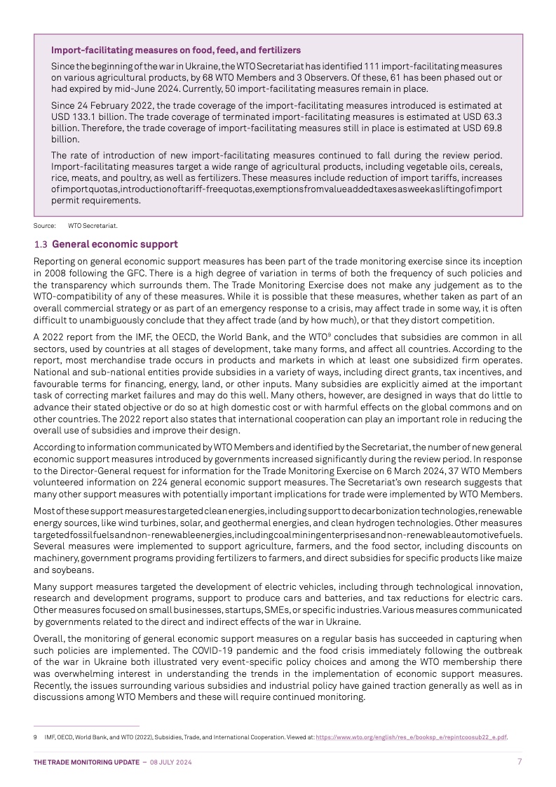 根据7月8日发布的最新一期《贸易监测快报》,世贸组织成员在货物贸易方面采取的贸易促进措施继续多于贸易限制措施,这是一个重要信号,表明尽管当前地缘政治存在不确定性,各成员仍致力于保持贸易畅通。该《报告》涵盖 2023 年 10 月中旬至 2024 年 5 月中旬,其中还指出,产业政策补贴迅速增加,尤其是在与气候变化和国家安全相关的领域。