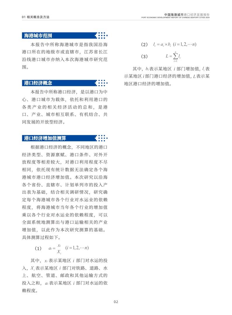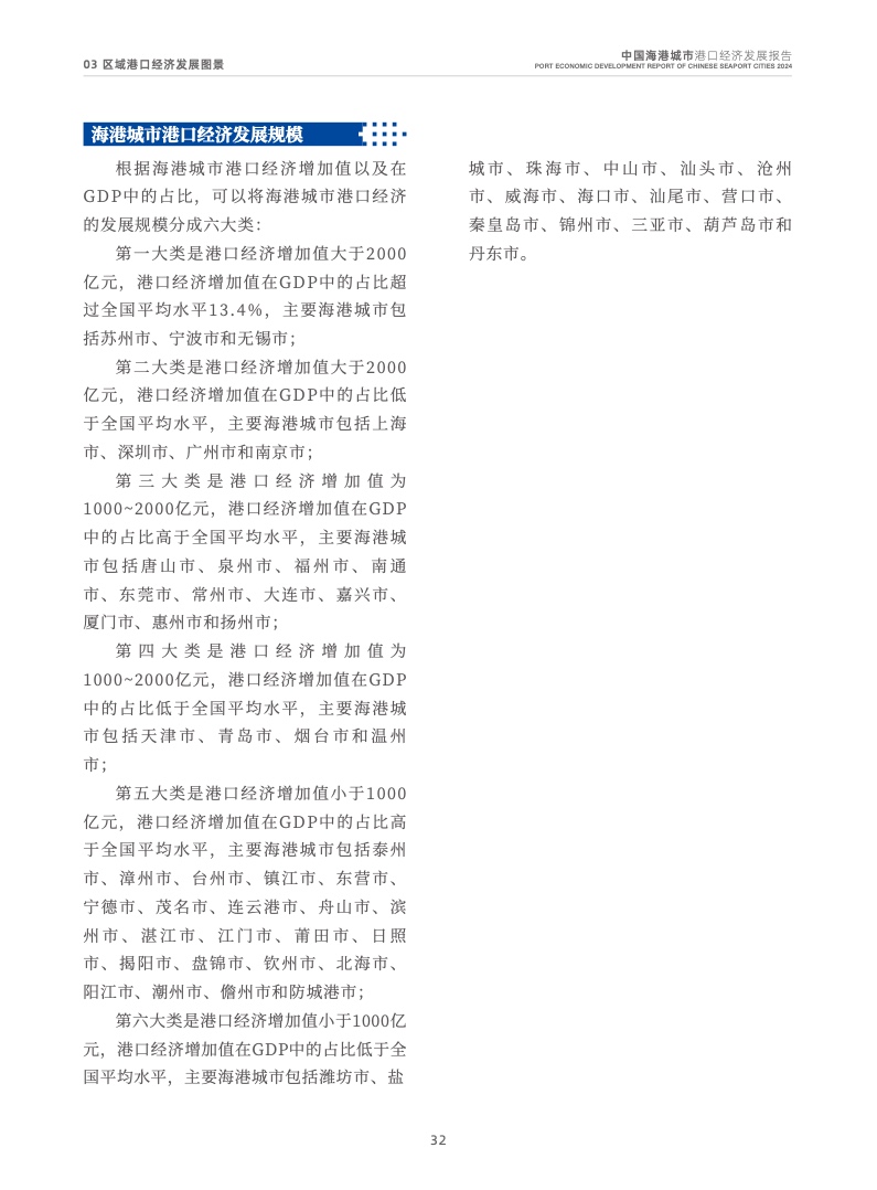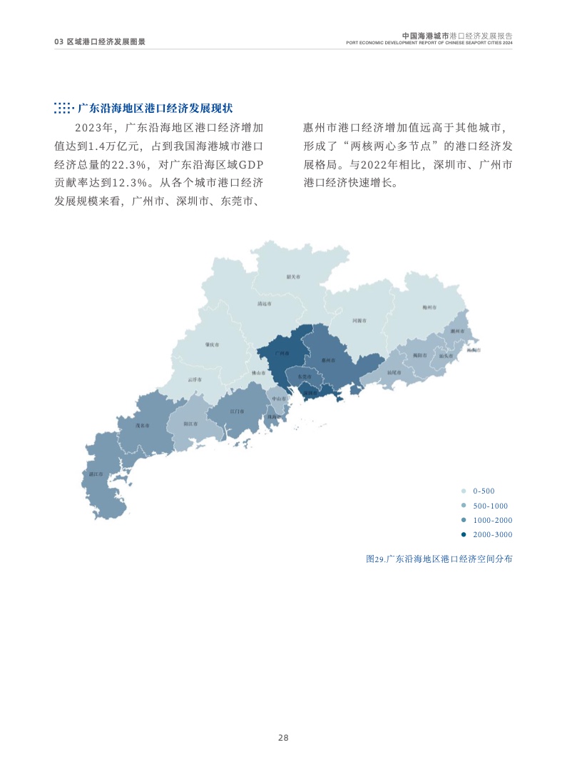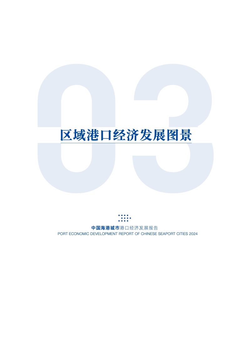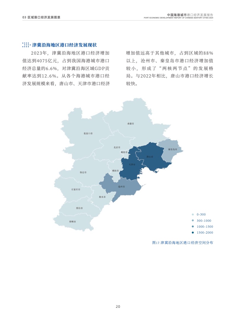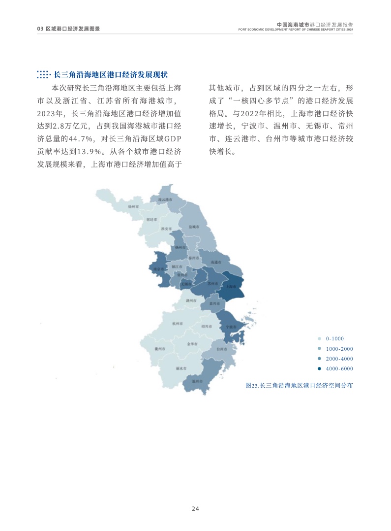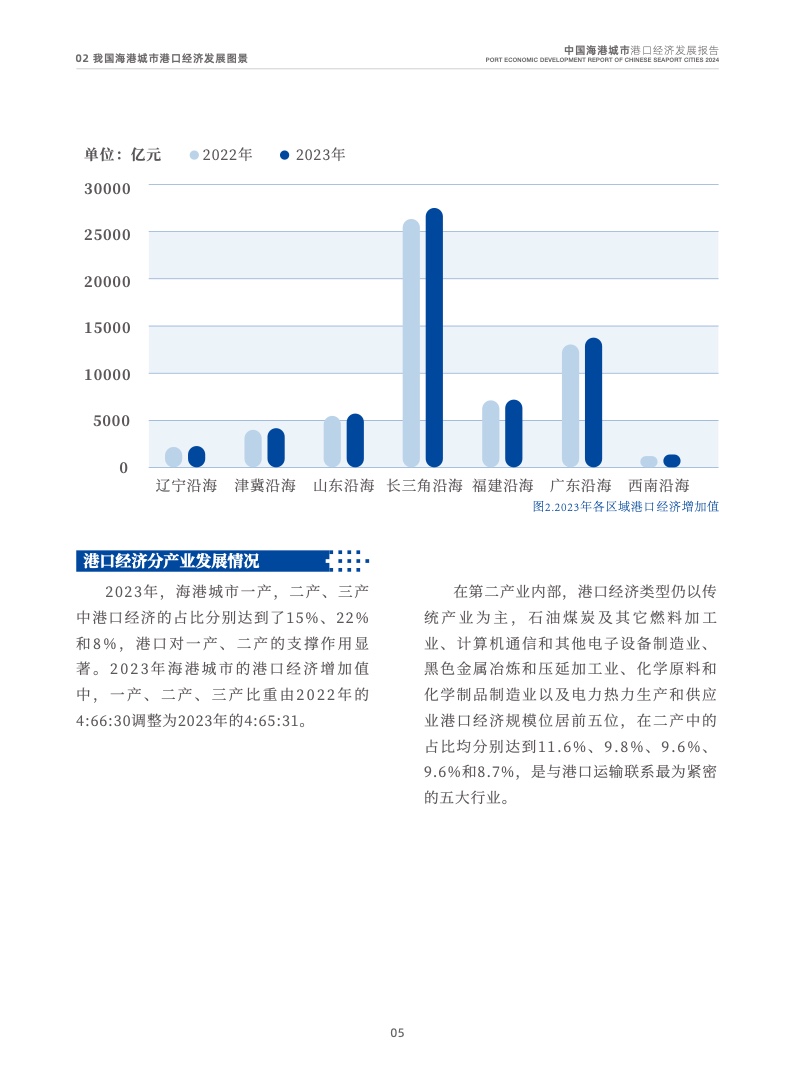 经测算,2023年我国海港城市港口经 济增加值达到6.2万亿元,占到这些城市经 济总量的13.4%,与2022年相比,规模增 长1929亿元。从整体上看,中国海港城市 港口经济呈现“一核、两区、多片”的空 间格局,形成了以上海、苏州等城市群为 “一核”引领,以长三角区域和珠三角区 域为“两区”协同发展,以环渤海区域、 东南沿海区域、西南沿海区域“多片”共 同发展的空间格局。