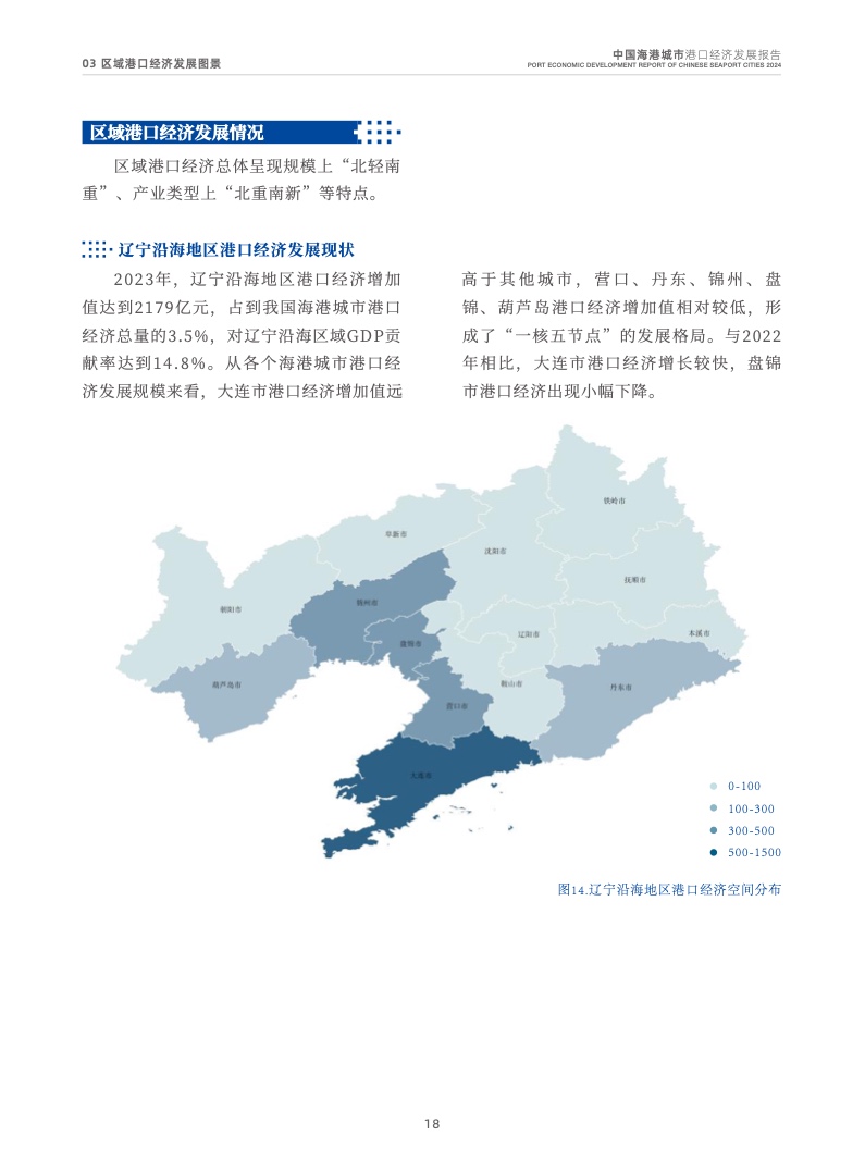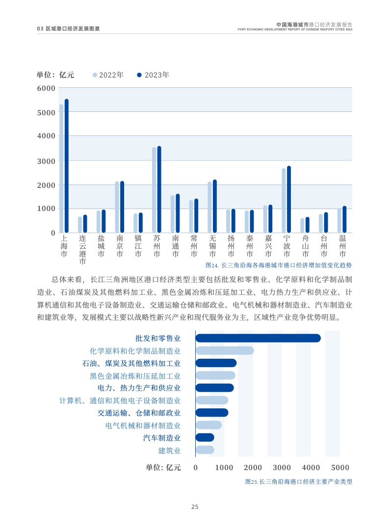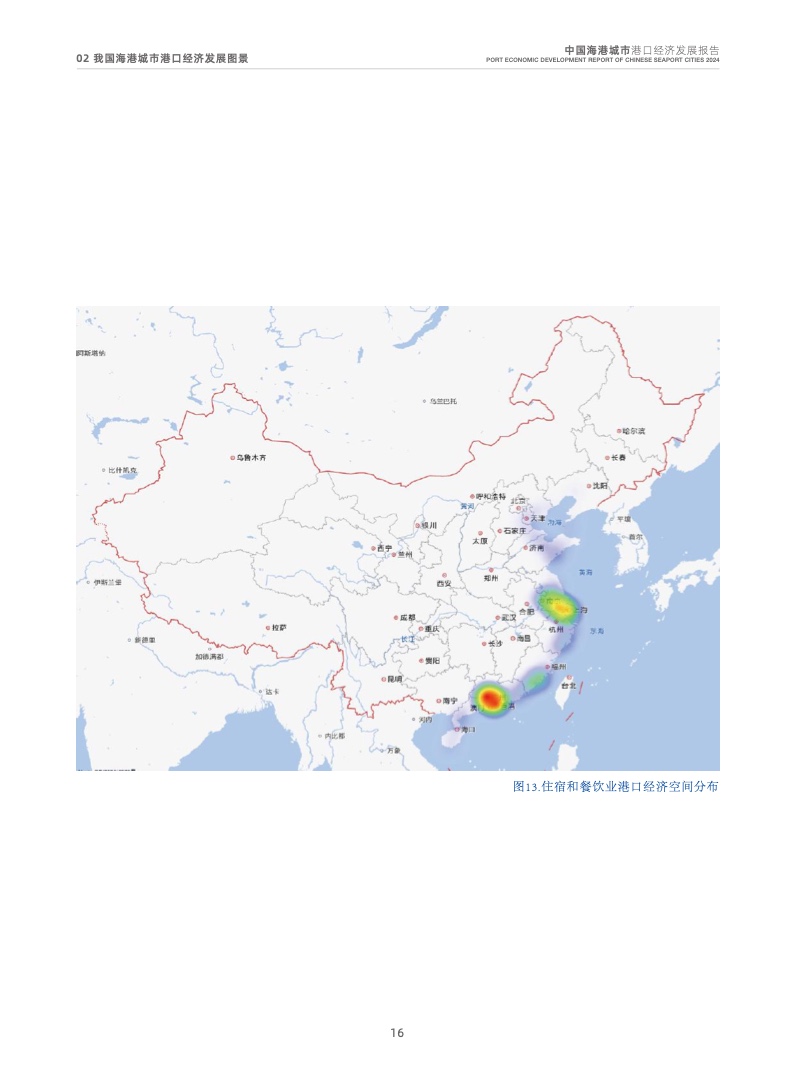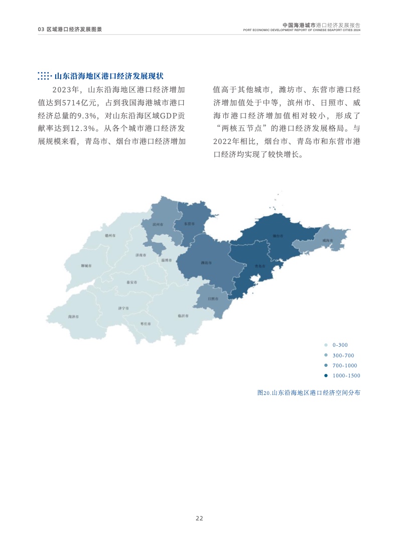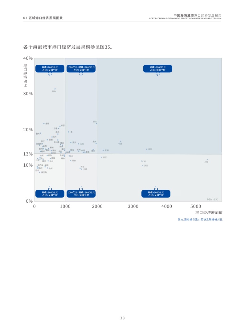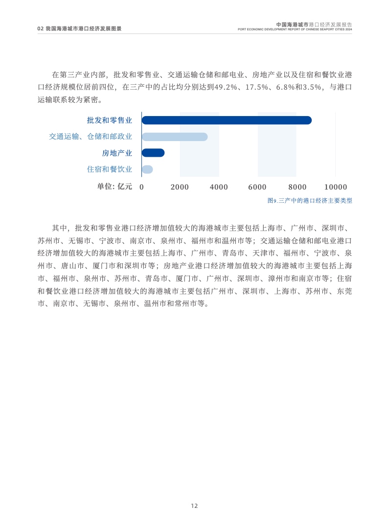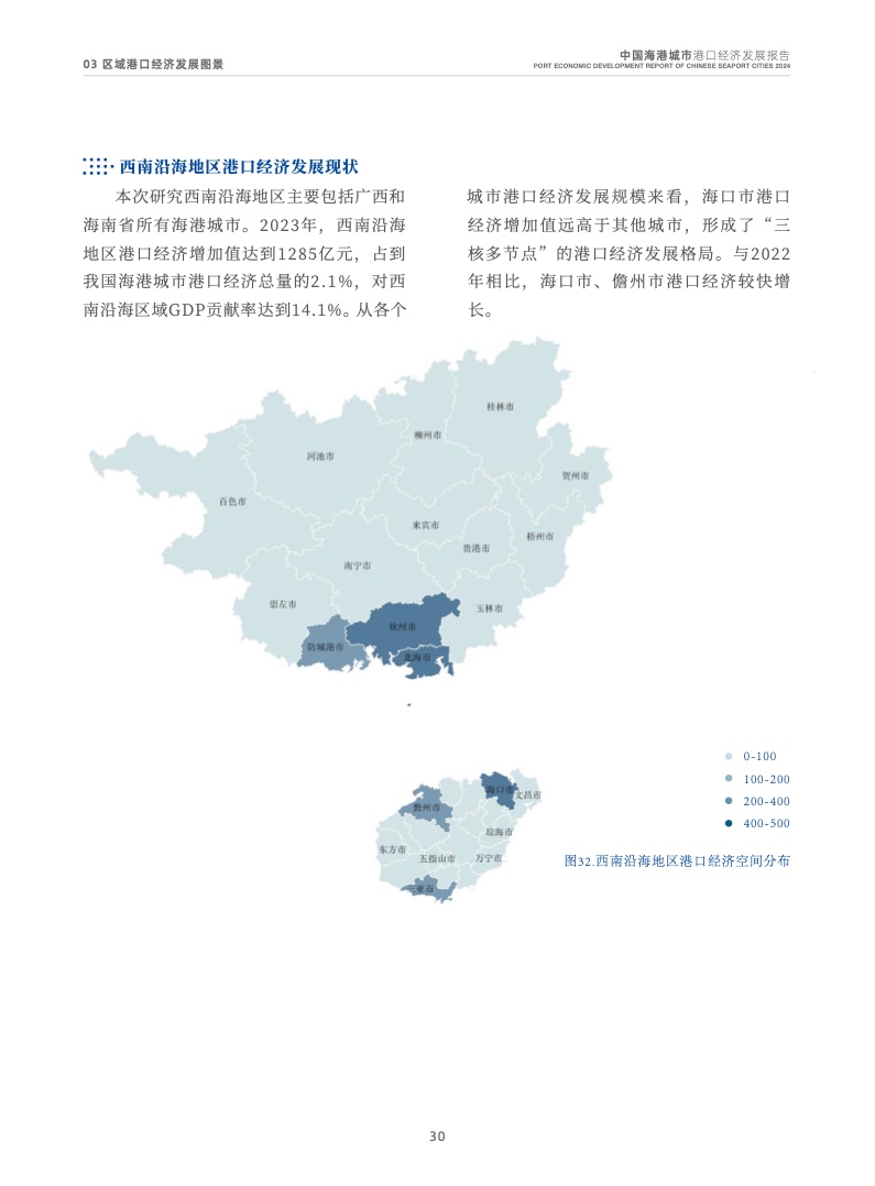 经测算,2023年我国海港城市港口经 济增加值达到6.2万亿元,占到这些城市经 济总量的13.4%,与2022年相比,规模增 长1929亿元。从整体上看,中国海港城市 港口经济呈现“一核、两区、多片”的空 间格局,形成了以上海、苏州等城市群为 “一核”引领,以长三角区域和珠三角区 域为“两区”协同发展,以环渤海区域、 东南沿海区域、西南沿海区域“多片”共 同发展的空间格局。