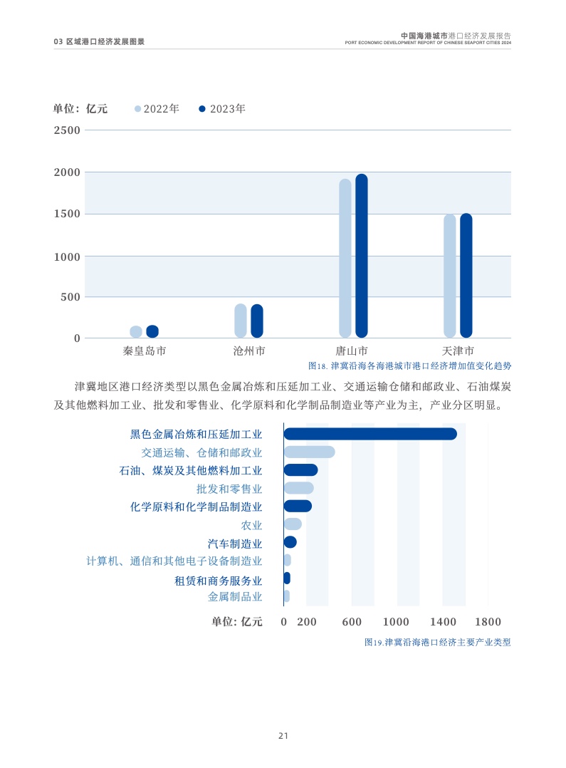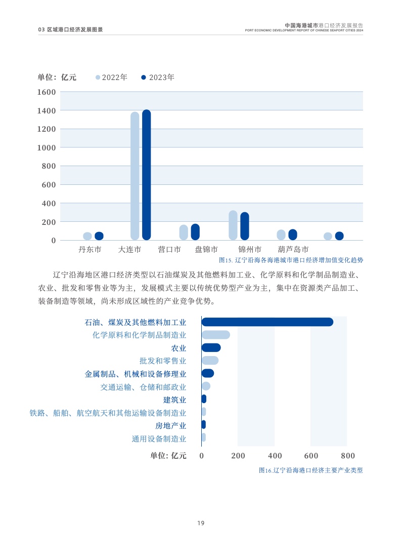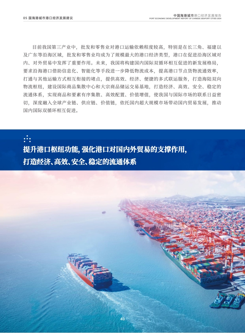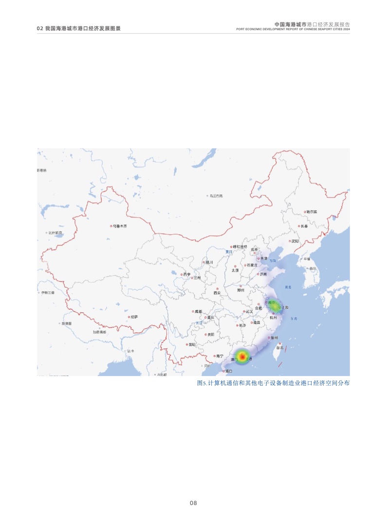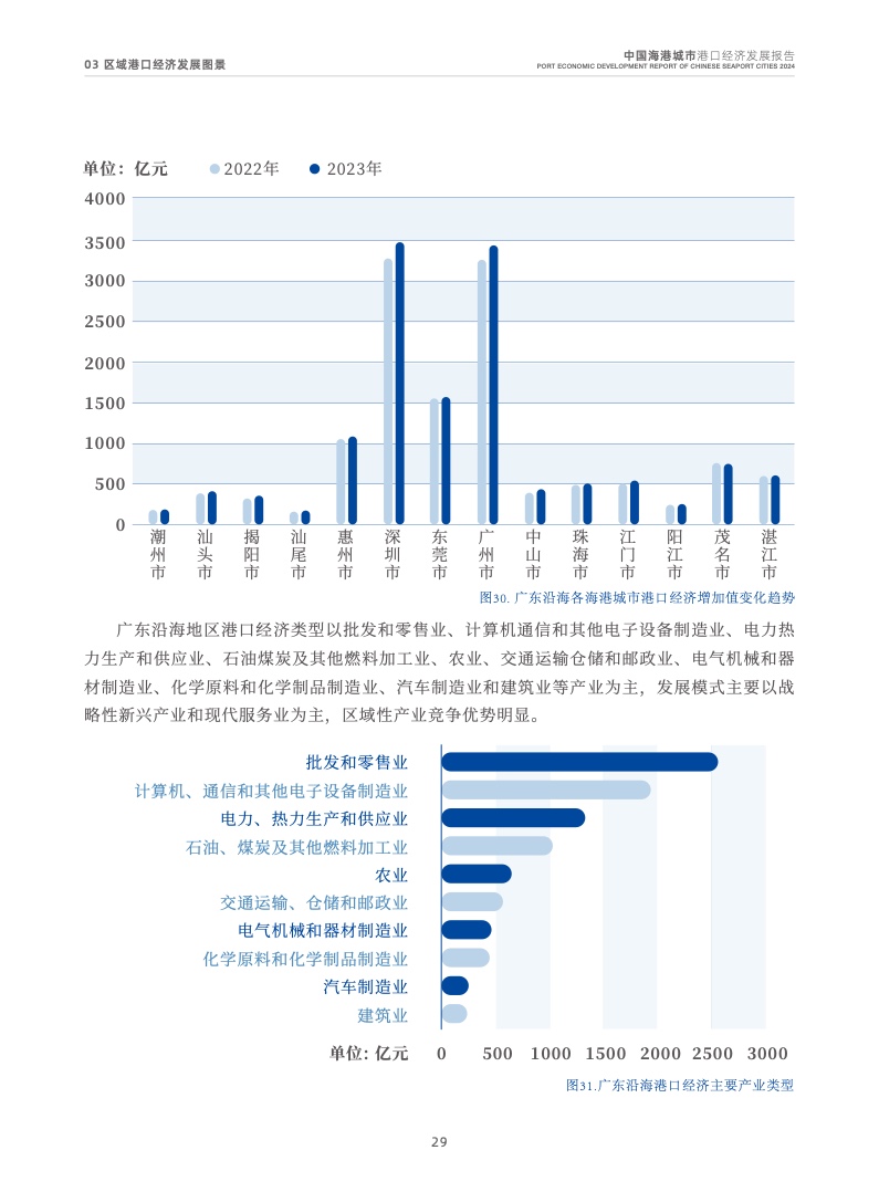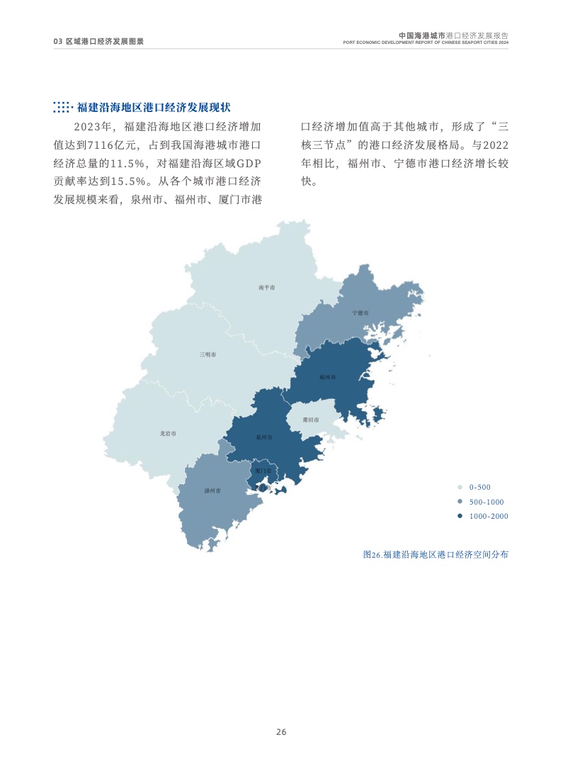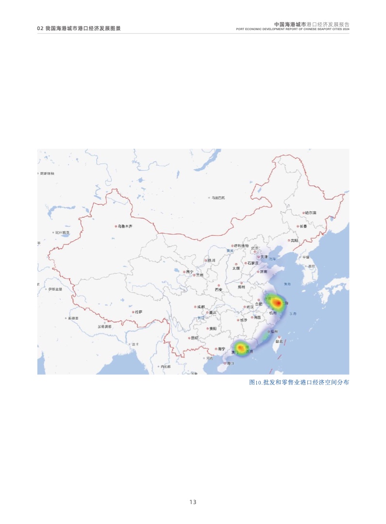 经测算,2023年我国海港城市港口经 济增加值达到6.2万亿元,占到这些城市经 济总量的13.4%,与2022年相比,规模增 长1929亿元。从整体上看,中国海港城市 港口经济呈现“一核、两区、多片”的空 间格局,形成了以上海、苏州等城市群为 “一核”引领,以长三角区域和珠三角区 域为“两区”协同发展,以环渤海区域、 东南沿海区域、西南沿海区域“多片”共 同发展的空间格局。