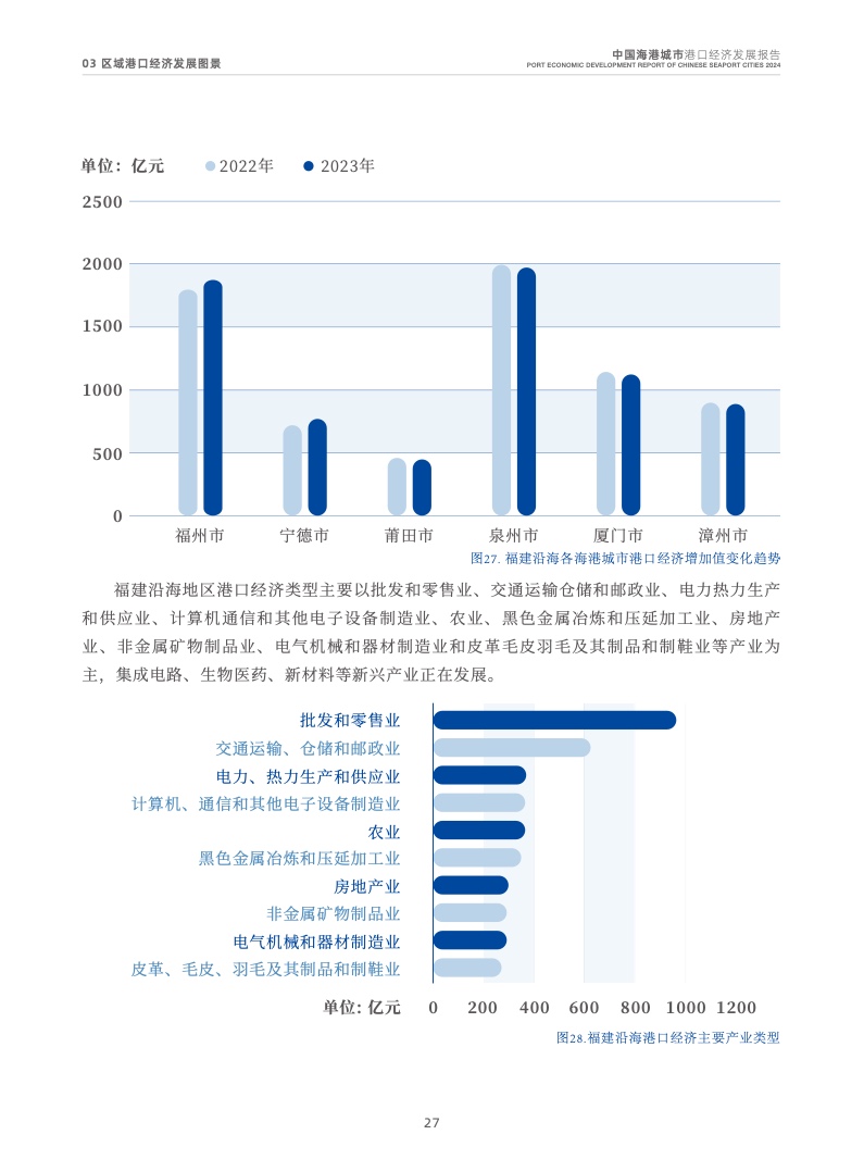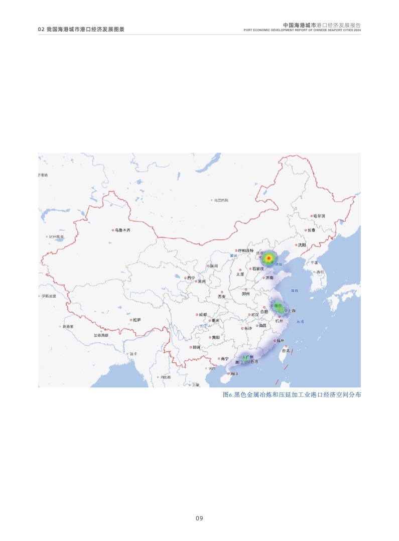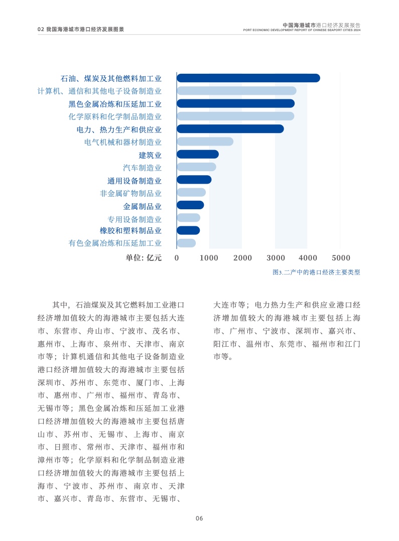 在第二产业内部,港口经济类型仍以传 统产业为主,石油煤炭及其它燃料加工 业、计算机通信和其他电子设备制造业、 黑色金属冶炼和压延加工业、化学原料和 化学制品制造业以及电力热力生产和供应 业港口经济规模位居前五位,在二产中的 占比均分别达到11.6%、9.8%、9.6%、 9.6%和8.7%,是与港口运输联系最为紧密 的五大行业。