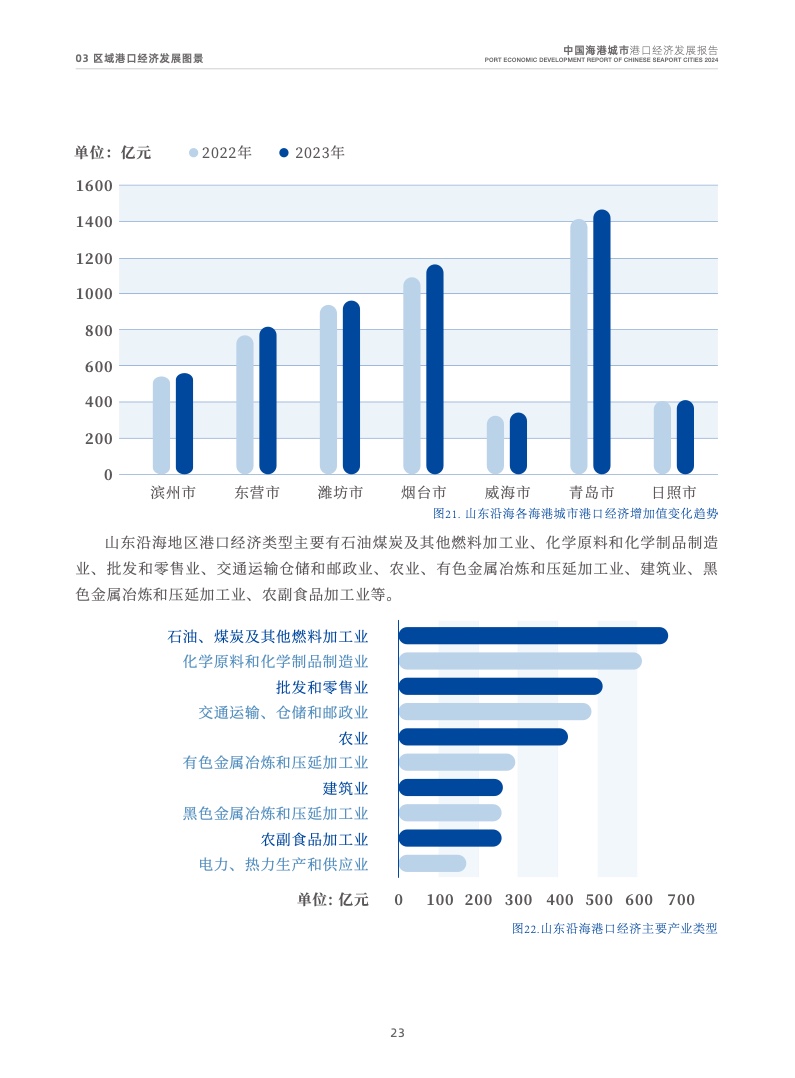 其中,长三角区域海港城市港口经济 增加值占到全国海港城市的44.7%,是我 国沿海地区港口经济最发达的区域。与 2022年相比,山东、长三角、广东、西南 沿海地区海港城市港口经济在全国的占比 分别提升了0.1、 0.1、0.2和0.1个百分 点,辽宁、津冀地区、福建海港城市港口 经济在全国的占比分别下降了0.1、 0.1和 0.3个百分点。