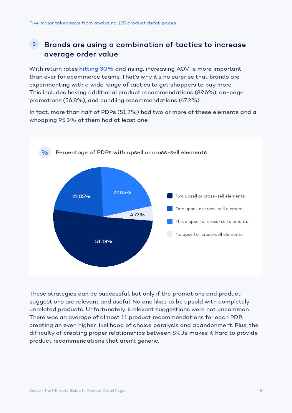 95%的页面至少有一个追加销售或交叉销售元素,超过1/5的页面(22%)有三个或更多。报告警告说,一些建议是无关紧要的,平均每页11个产品推荐,品牌可能会导致决策瘫痪和/或放弃。