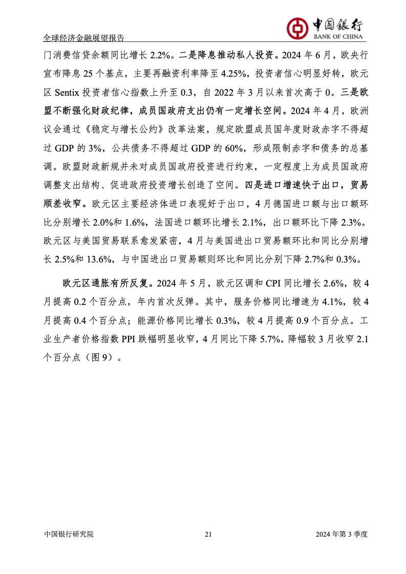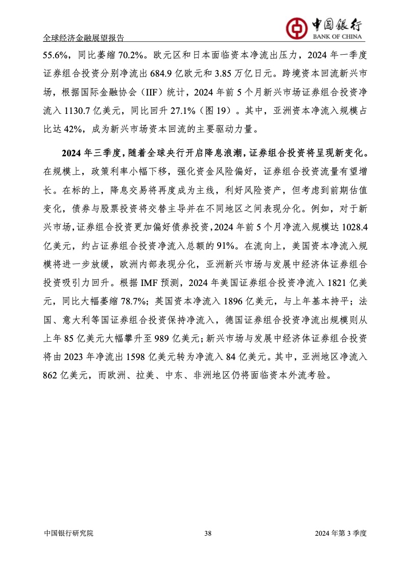 展望 2024 年三季度,全球经济增速将延续二季度表现,可能呈现总需求小幅调整、总供给恢复的运行特征。私人消费增速可能放缓,私人投资逐渐触底,全球贸易大概率延续复苏态势。全球通胀继续回落,但反复风险依然存在。全球央行将相继开启降息,流动性供给总体平稳,大宗商品市场地缘政治风险溢价有望下降。