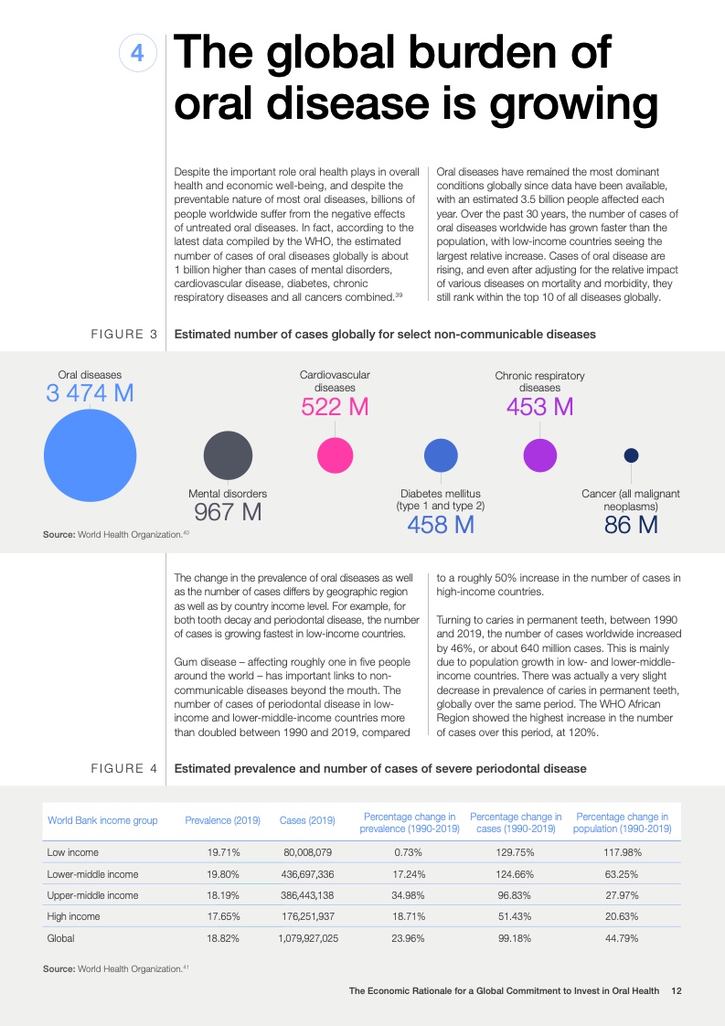 全球近一半人口受到口腔疾病的影响,且病例增长速度超过全球人口的增长速度。根据世界卫生组织(WHO)的最新数据,全球口腔疾病患者数比精神障碍、心血管疾病、糖尿病、慢性呼吸道疾病和所有癌症患者数的总和还多大约10亿。