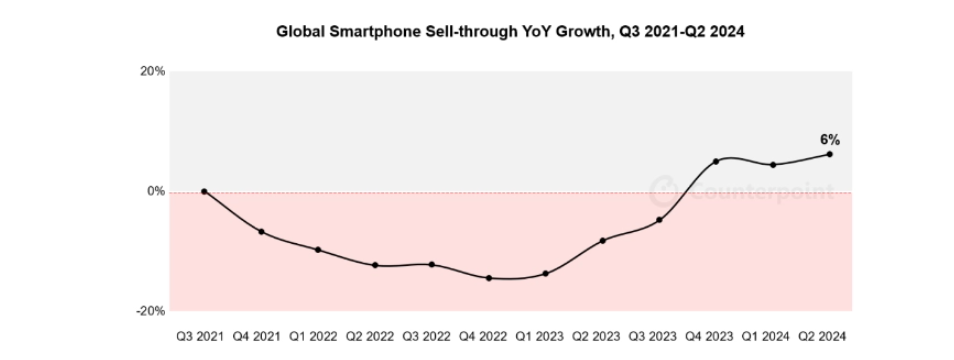 调研机构Counterpoint Research给出的最新报告显示,2024年第二季度全球智能手机销量同比增长6%,创下三年来最高的同比增长率。报告中显示,三星继续稳坐全球手机销量第一,份额达到了20%,同比增长5%,而苹果紧随其后,份额是16%、同比下滑1%。