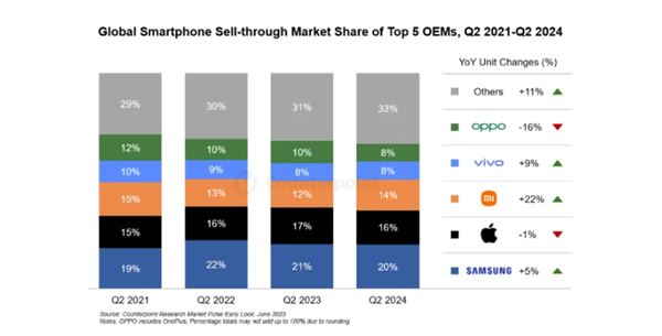 Counterpoint分析称,前五大品牌的累计份额同比下降,主要是受到来自华为、荣耀等品牌压力。
