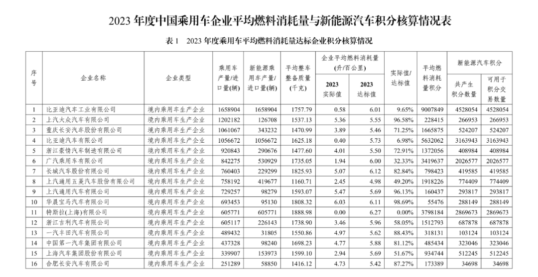 根据《乘用车企业平均燃料消耗量与新能源汽车积分并行管理办法》(工业和信息化部、财政部、商务部、海关总署、质检总局令 第44号)和《关于修改〈乘用车企业平均燃料消耗量与新能源汽车积分并行管理办法〉的决定》(工业和信息化部、财政部、商务部、海关总署、市场监管总局令 第53号)要求,现将2023年度中国乘用车企业平均燃料消耗量与新能源汽车积分情况予以公告。