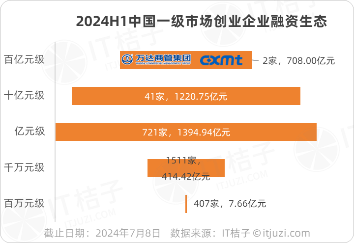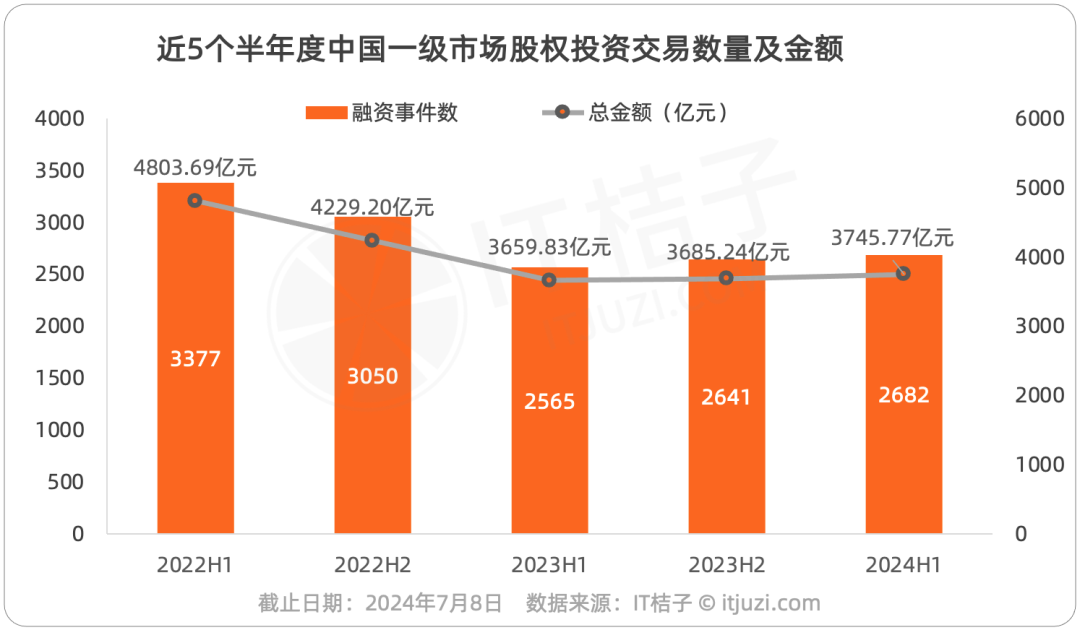 IT 桔子数据显示,2024 年上半年,国内一级市场私募股权融资事件数有 2682 起,环比增长 1.56%,同比增长 4.56%;估算总投资额约为 3745.77 亿元,环比增长 1.64%,同比增长 2.35%。