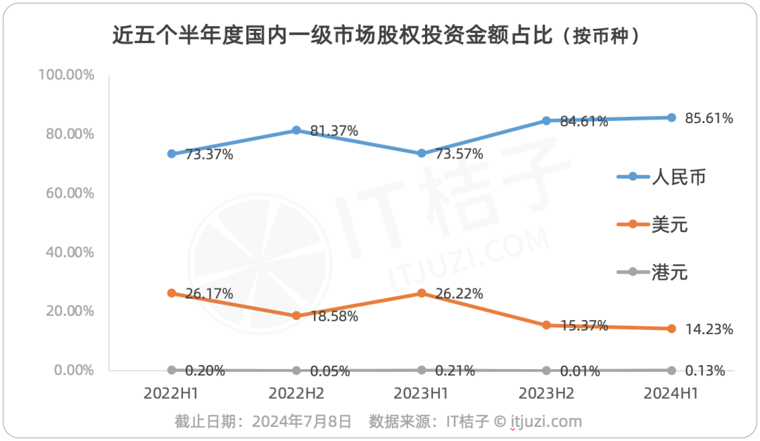 根据 IT 桔子数据,近三年,人民币投资金额占比总体上呈现出稳中上升的趋势,从 2022 年 H1 的 73.37% 增加到 2024 年 H1 的 85.61%,其中 2023 年 H1 稍有回落,下降为 73.57%。