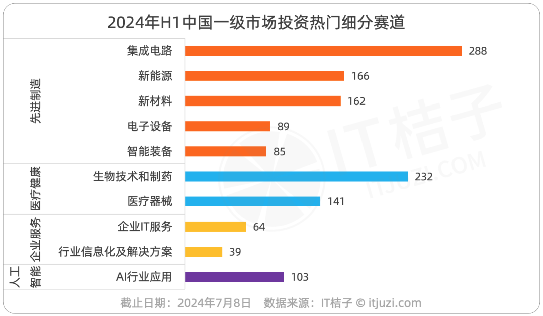 2024 年上半年中国一级市场投资最活跃的细分赛道包括集成电路、生物技术和制药、新能源、新材料以及医疗器械等领域。