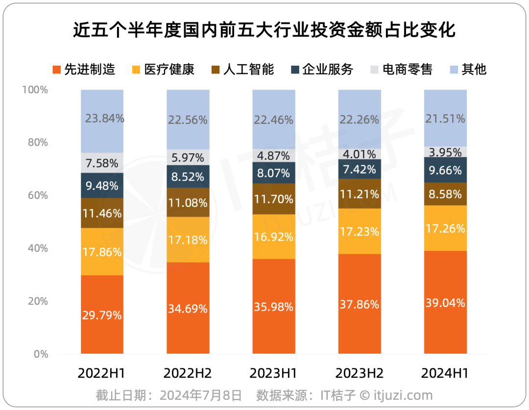 2024 年上半年,先进制造行业是连续 5 个半年度最热门的投资行业(按融资总额),占比进一步提升为 39.04%;涉及集成电路、新能源、新材料等诸多领域,此类硬科技投资热潮也侧面反映了人民币基金主导下政策的诉求。