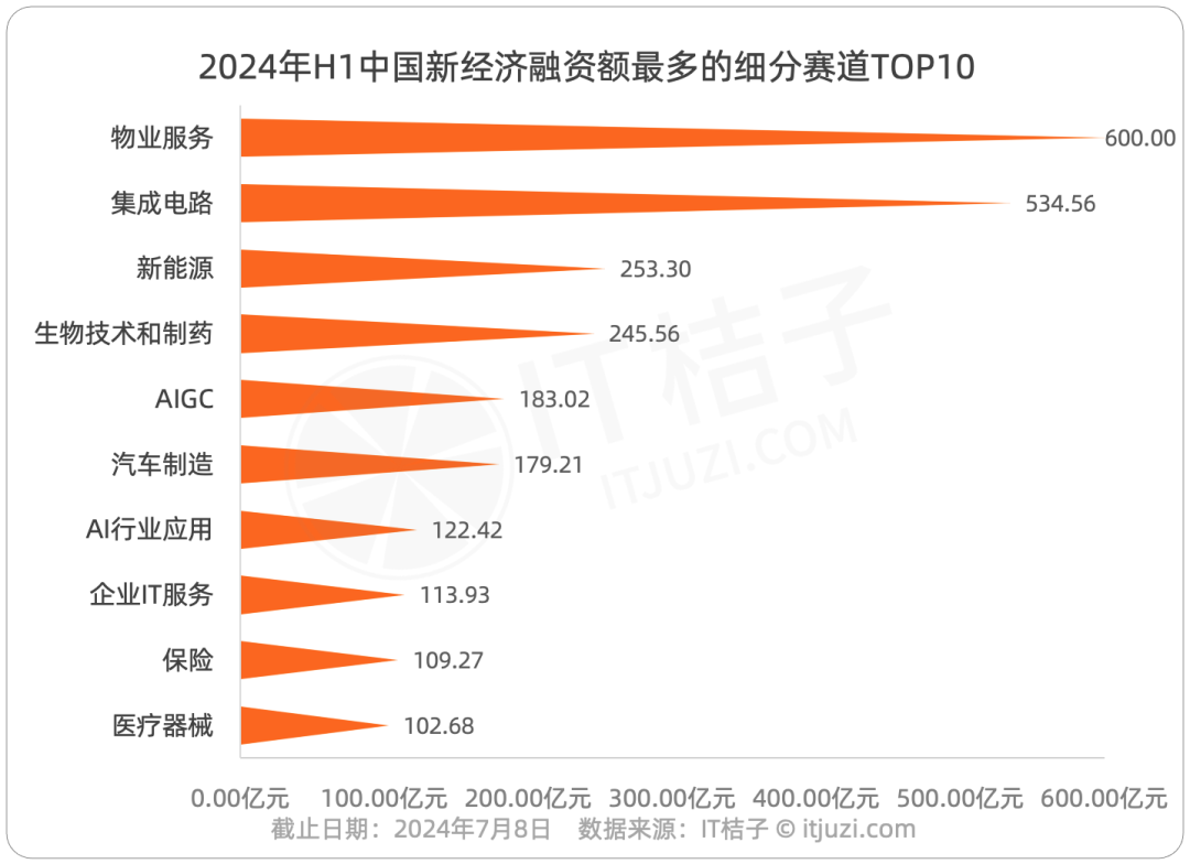 2024 年上半年中国新经济领域融资额最多的十大细分赛道包括物业服务、集成电路、新能源、生物技术和制药、AIGC、汽车制造、AI 行业应用等行业。