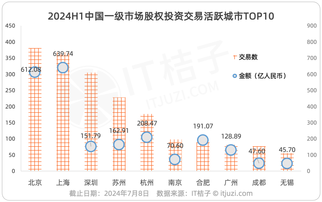 从一级市场实际完成的投资交易事件来看,国内活跃度较高的 10 个城市是北京、上海、深圳、苏州、杭州、南京、合肥、广州、成都、无锡。