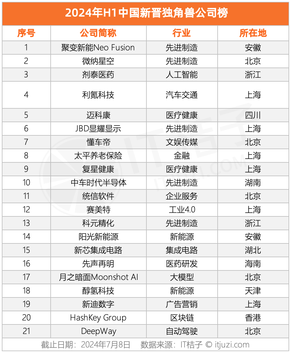 在 2024 年上半年,共有 21 家国内创业公司晋级为估值达到 10 亿美元 + 的独角兽,其中,Q1 有 11 家、Q2 有 10 家新晋独角兽,包括: