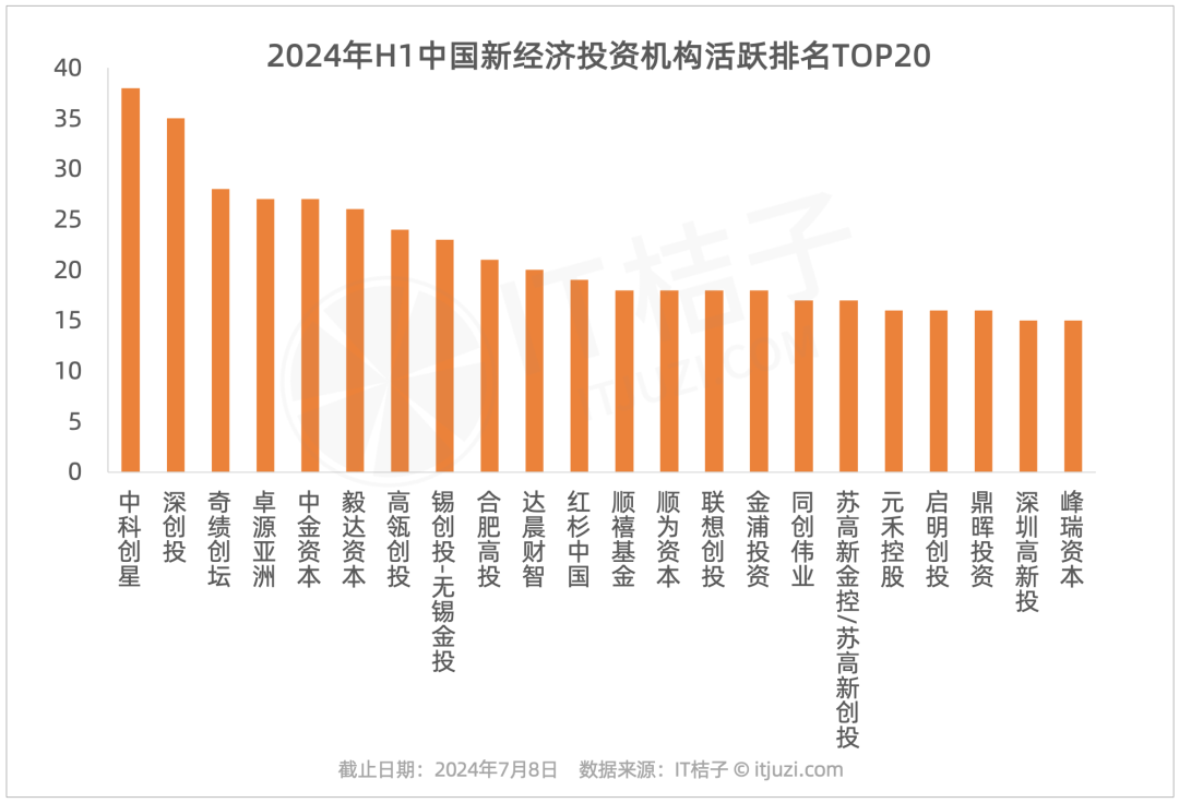 IT 桔子数据显示,从投资出手次数看,中科创星是 2024 年上半年国内活跃投资机构的榜首,深创投居第二位,奇绩创坛、卓源亚洲、中金资本跃居活跃榜前五名。