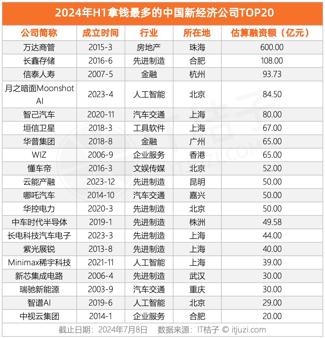 Q1 宣布新融资的大模型公司月之暗面 Moonshot AI、光伏上市公司「阳光电源」分拆出的阳光新能源;以及在 Q2 季度宣布融资 10 亿元的商业卫星系统研制供应商「微纳星空」、融资 1 亿美元的 AI 制药公司「剂泰医药」,融资 8 亿美元、从字节跳动拆分的汽车资讯平台「懂车帝」。