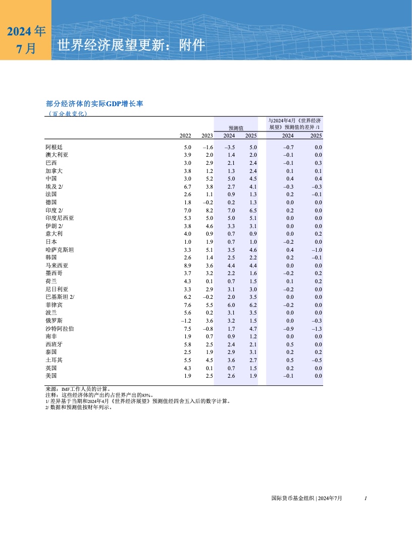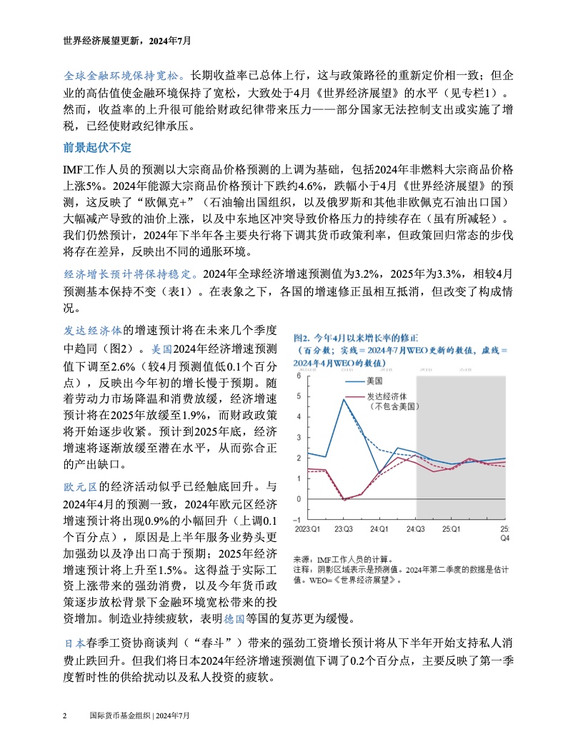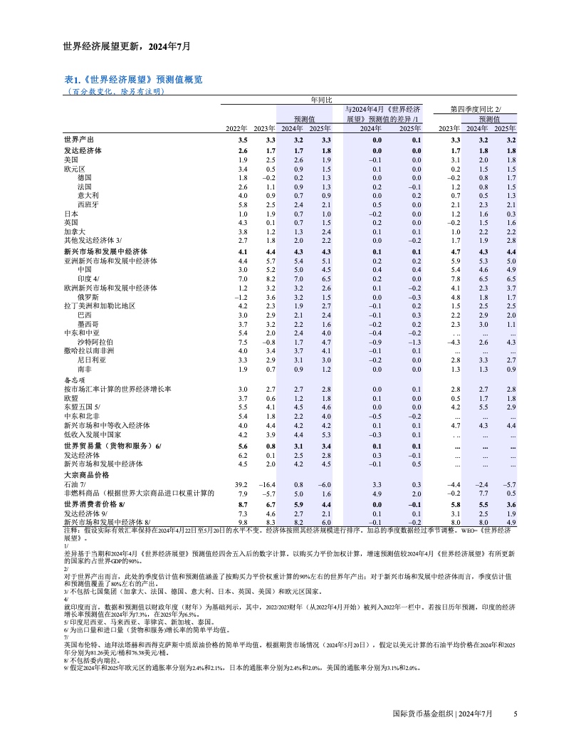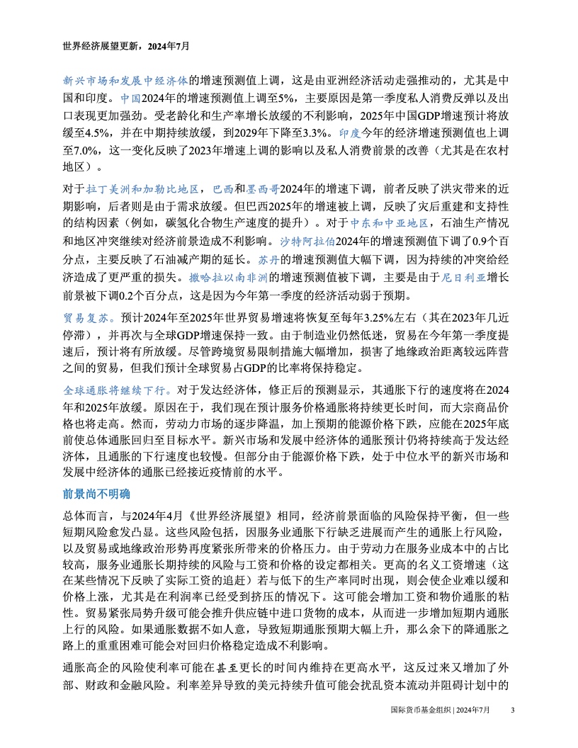 国际货币基金组织周二发布的《世界经济展望》更新报告预计,全球经济增速将与4月预测值保持一致:2024年增速为3.2%,2025年为3.3%。