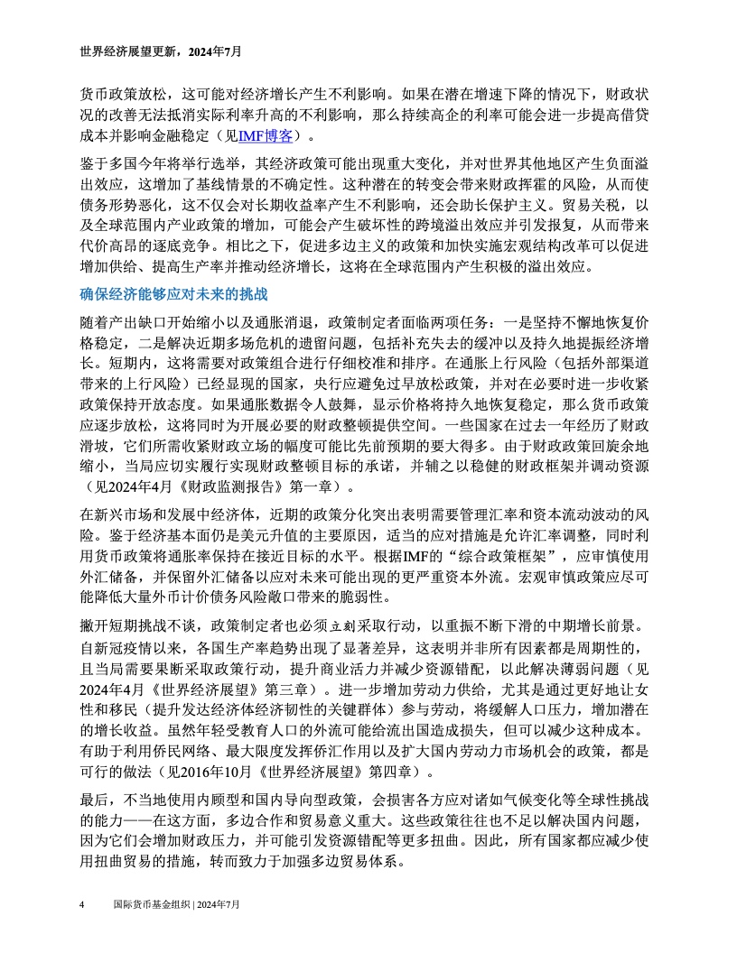 报告指出,总体而言,与2024年4月《世界经济展望》相同,经济前景面临的风险保持平衡,但一些短期风险愈发凸显。这些风险包括,因服务业通胀下行缺乏进展而产生的通胀上行风险,以及贸易或地缘政治形势再度紧张所带来的价格压力。