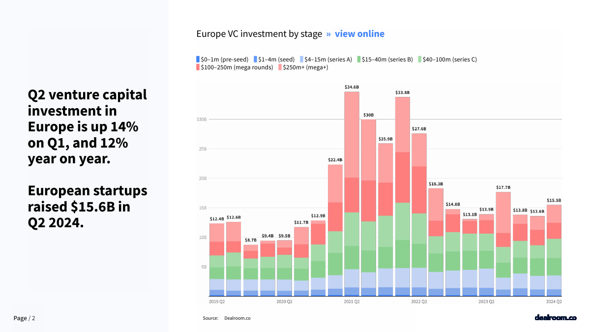欧洲初创企业在2024年第二季度获得投资156亿美元。