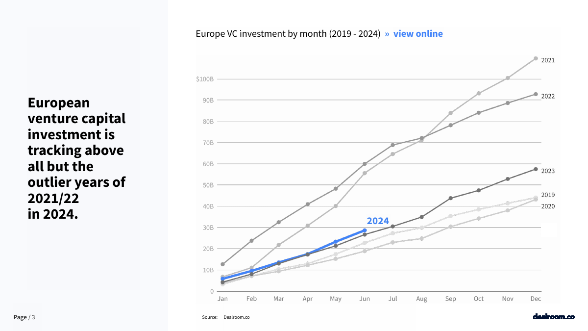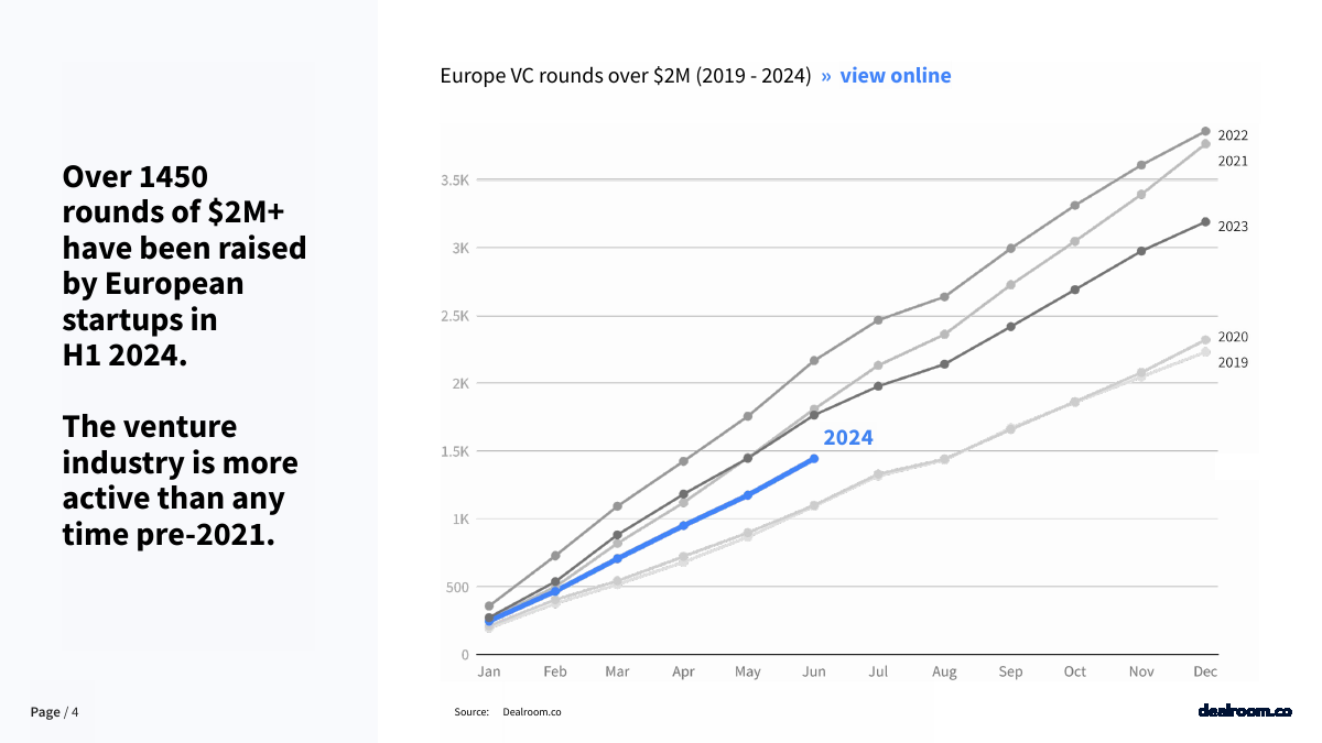 在2024年上半年,欧洲初创公司已经完成了超过1450笔200万美元以上的交易。