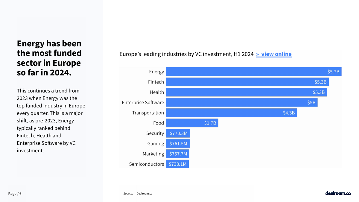 延续自2023年以来的趋势,当时能源是欧洲每个季度获得投资最多的行业。这是一个重大转变,因为在2023年之前,能源行业通常被风投排在金融科技、健康和企业软件之后。