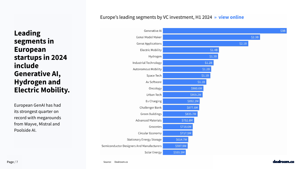 2024年欧洲初创公司的领先领域包括人工智能、氢能源和电动汽车。