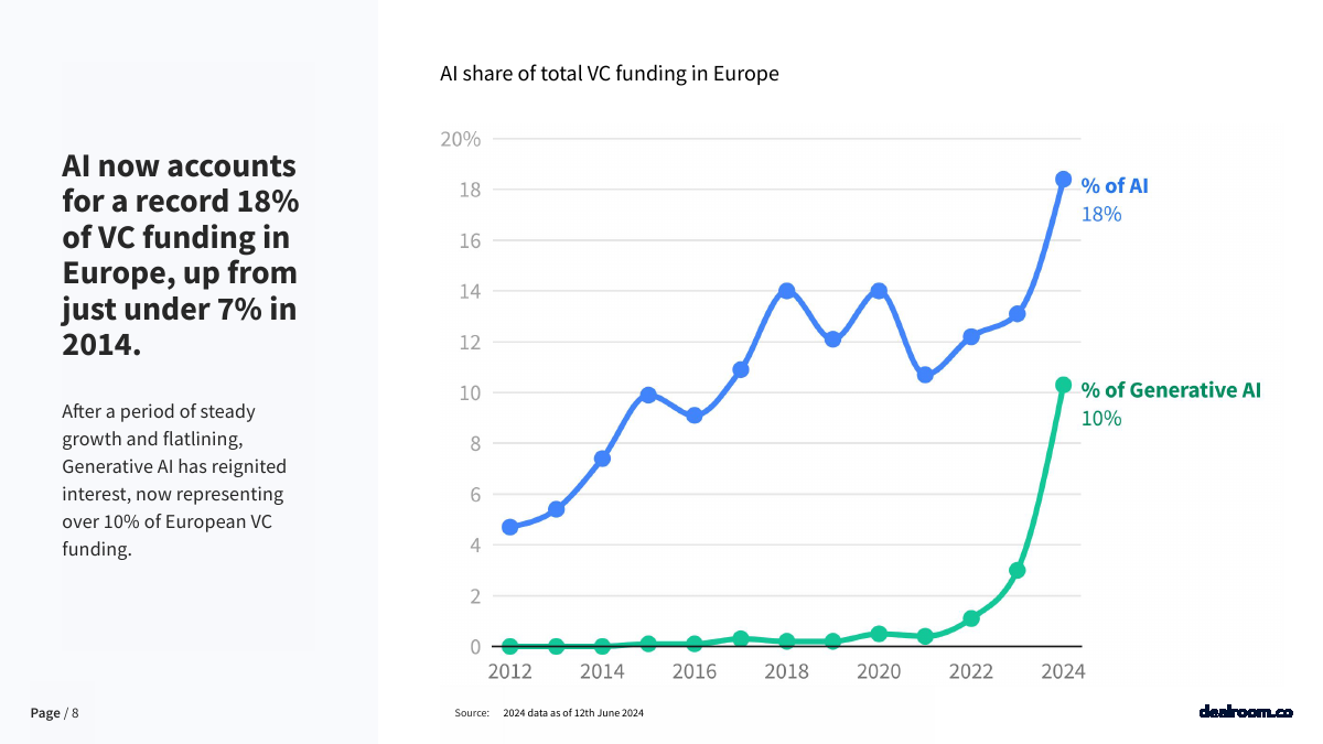 在经历了一段时间的稳定增长和平缓之后,生成式人工智能重新引起了人们的兴趣,现在占欧洲风险投资的10%以上。